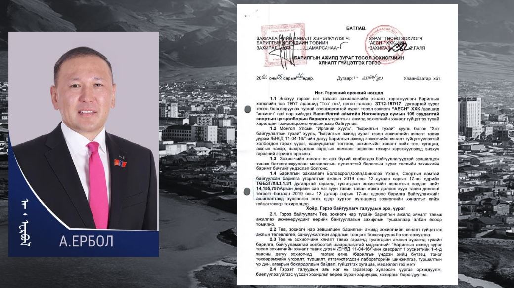 Баян-Өлгий аймгийн ИТХ-ын төлөөлөгч Ахмет Ербол эхнэр Сериктес Галягийн нэр дээр “АЕСН” ХХК-ийг эзэмшдэг. “АЕСН” ХХК нь улсын төсвийн санхүүжилттэй, барилга байгууламжийн зураг төслийн 150 тендерт оролцсон. Өөрөөр бол, Баян-Өлгий аймгийн барилга, байгууламжийн зураг төслүүдэд “АЕСН” ХХК нь шалгардаг ажээ. Тухайлбал, “АЕСН” ХХК нь хамгийн сүүлд: