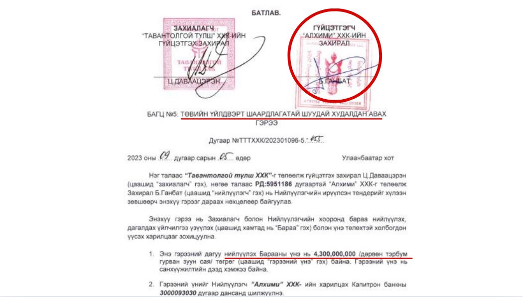 | ЭЛЧИН САЙД Ө.ЭНХТҮВШИНГИЙН ТУСЛАХ АСАН А.АЛТАНХУЯГИЙН ХАДАМ ДҮҮ “ТАВАНТОЛГОЙ ТҮЛШ” ХХК-Д 34.4 ТЭРБУМ ТӨГРӨГИЙН ШУУДАЙ “ШАХЖЭЭ” |
