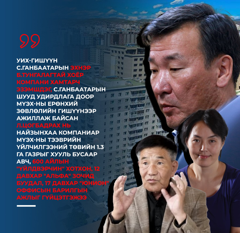 Эцэст нь, УИХ-ын гишүүн С.Ганбаатар хөрөнгө орлогоо нуун дарагдуулсан, эхнэрийнхээ нэр дээрх компани, аж ахуйн нэгжийг хуулийн дагуу мэдүүлээгүй ноцтой зөрчил хууль хяналтын байгууллагад шалгагдаж байна. Үүнээс гадна, “Альфа” зочид буудлын захирал Н.Энхманлайгаар дамжуулан МҮЭХ-ны эзэмшлийн зочид буудлаас орлого олж, хувийн эзэмшлийн аж ахуй нэгжүүүдээрээ дамжуулан татвараас зайлсхийж, мөнгө угааж, хувьдаа завшсан байж болзошгүй ноцтой хэргийн сэжүүрийг хууль хяналтынхан атгаад авчээ.