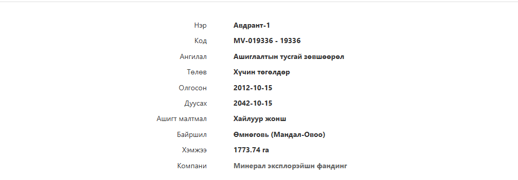 -Ашиглалтын тусгай зөвшөөрөлтэй 1773.74 га талбай бүхий Авдрантын хайлуур жоншны ордыг “Зөв зүг” ХХК-д “Минерал Эксплорейшн Фандинг” компаниас шилжүүлж өгчээ.