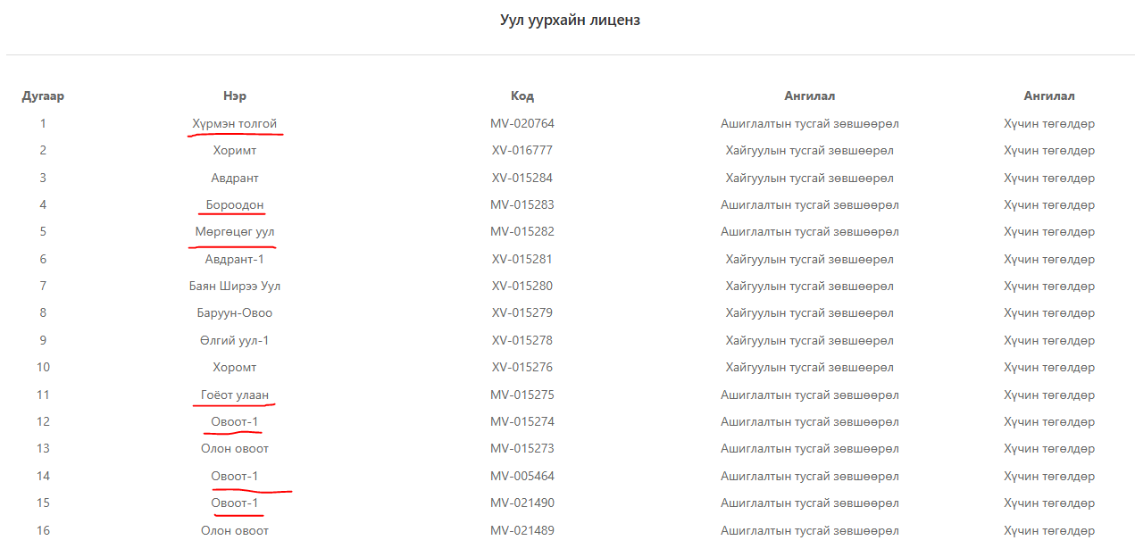 Тайлбар: АМГТГ-ын дарга асан Ш.Ганхуягийн "Олон овоот гоулд" ХХК-д шилжүүлсэн ашиглалтын долоон лиценз