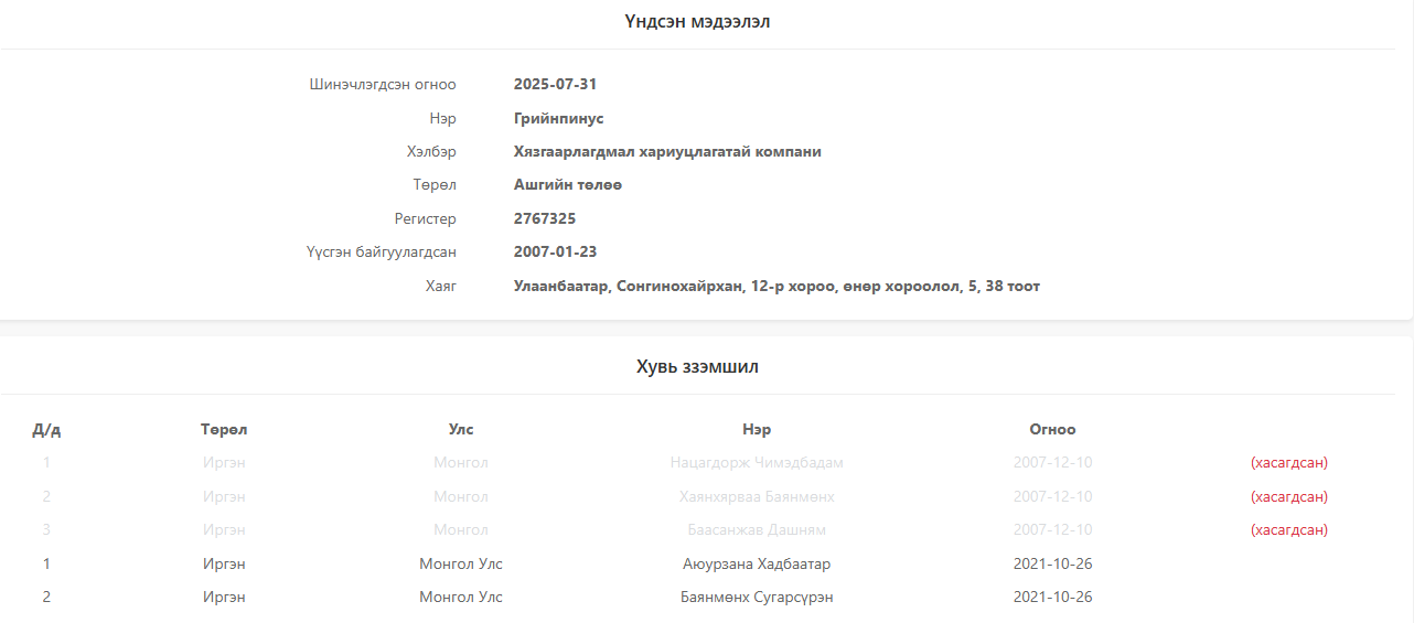 “Грийнпинус” ХХК-ийн хувьцаа эзэмшигчээр Аюурзанын Хадбаатар, Баянмөнхийн Сугарсүрэн бүртгэлтэй. Үүсгэн байгуулагч нь Х.Баямөнх аж. Хувьцаа эзэмшигч А.Хадбаатар нь “Гэрэгэ тауэр”-ын 14 дүгээр давхрын өмчлөлийн хэрэгт холбогдож, цагдан хоригдсон гэх Д.Хишигбаярын хадам дүү ажээ. Д.Хишигбаярын эхнэр Б.Нандин-Эрдэнийн дүү Б.Насан-Эрдэнэ “Грийнпинус” ХХК-ийн нягтлан бодогчоор ажилладаг.