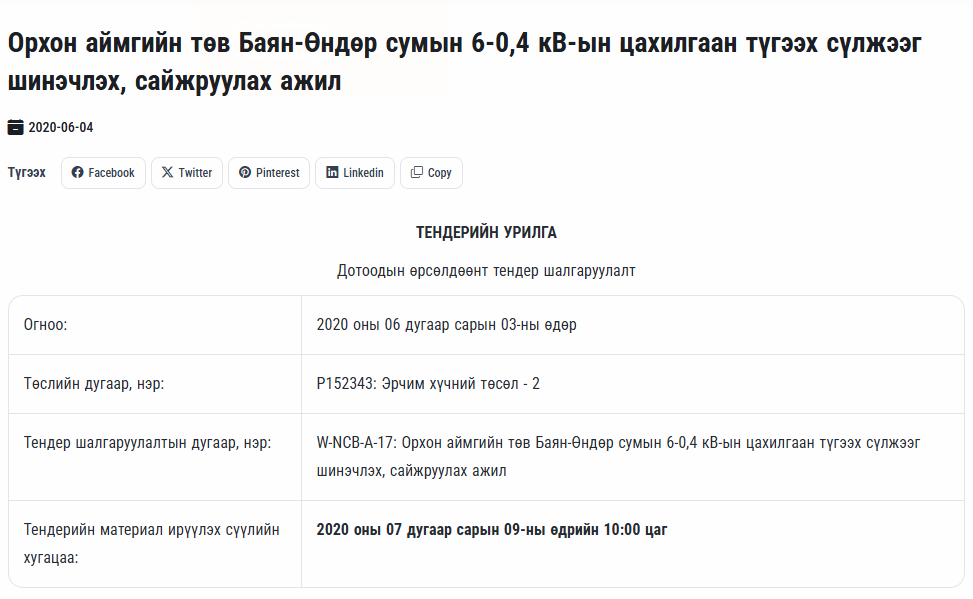 АТГ-аас өгсөн мэдээллээр “Эрдэнэт, Булганы цахилгаан түгээх сүлжээ” төрийн өмчит хувьцаат компанийн удирдах албан тушаалтан А, А, Э нар нь “Орхон аймгийн төв Баян-Өндөр сумын 6-0,4 кВ-ын цахилгаан түгээх сүлжээг шинэчлэх, сайжруулах ажил”-ыг гүйцэтгэгч компанийн дутуу хийсэн ажлыг “Эрдэнэт, Булганы цахилгаан түгээх сүлжээ” ТӨХК гүйцэтгэхээр гэрээ байгуулан ажил гүйцэтгэж, албаны чиг үүргээ хэрэгжүүлсний хариуд бусдаас нийтдээ 100,000,000 төгрөгийн хахууль авсан гэх 2602000000115, 2501000070071, 2602000000114 дугаартай эрүүгийн гурван хэрэгт мөрдөн шалгах ажиллагаа явуулсан. Дээрх нэр бүхий удирдах албан тушаалтнууд нь Дэлхийн банкны олон улсын хөнгөлөлттэй зээлийн санхүүжилтээр хэрэгжиж буй “Эрчим хүчний төсөл-2” хөтөлбөрийн хүрээнд “РИ” компанийн гүйцэтгэж байгаа Орхон аймгийн төвд баригдах цахилгаан түгээх сүлжээг шинэчлэх, сайжруулах ажлыг дутуу хийсэн, мөн улсын комиссоос ажиллуулах боломжгүй гэж дүгнэсээр байхад гүйцэтгэлийн хяналт баталгаажуулах тооллогын комиссын дүгнэлтийг гаргуулах, эрчим хүчний барилга байгууламжийг ашиглалтад оруулах улсын комиссын гишүүнээр ажиллахдаа саналын эрхтэй шийдвэр гаргасан байна. Улмаар албаны чиг үүргээ хэрэгжүүлсний хариуд “Р.И” компанийн захирал Г-ээс хадам дүүгээрээ дамжуулан бэлнээр 50,000,000 төгрөг, танил дүүгийнхээ дансаар 45,000,000 төгрөг, жолоочийнхоо дансаар 5,000,000 төгрөгийг хахуульд авсан 4 удаагийн үйлдлийг мөрдөн шалгах ажиллагааны явцад тогтоолоо. Уг эрүүгийн гурван хэрэгт хахуульд авсан нийт 100,000,000 төгрөгийг Төрийн сангийн Авлигатай тэмцэх газрын хохирлын дансанд төлүүллээ” гэсэн байдаг.