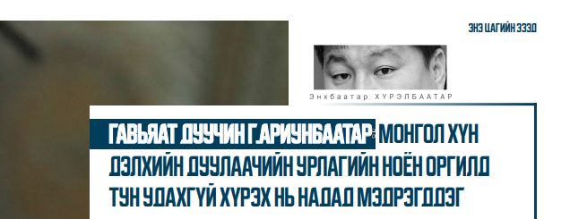 Монгол Улсын болон Буриад Улсын Гавьяат жүжигчин, Чингис хаан одонт, Цагдаагийн “Сүлд” чуулга, ОХУ-ын Санкт-Петербург хотын Мариинский театрт болон Буриадын Дуурь бүжгийн эрдмийн театрын гоцлол дуучин Г.Ариунбаатарыг "Энэ цагийн эзэн" булангаараа онцлон танд хүргэж байна.