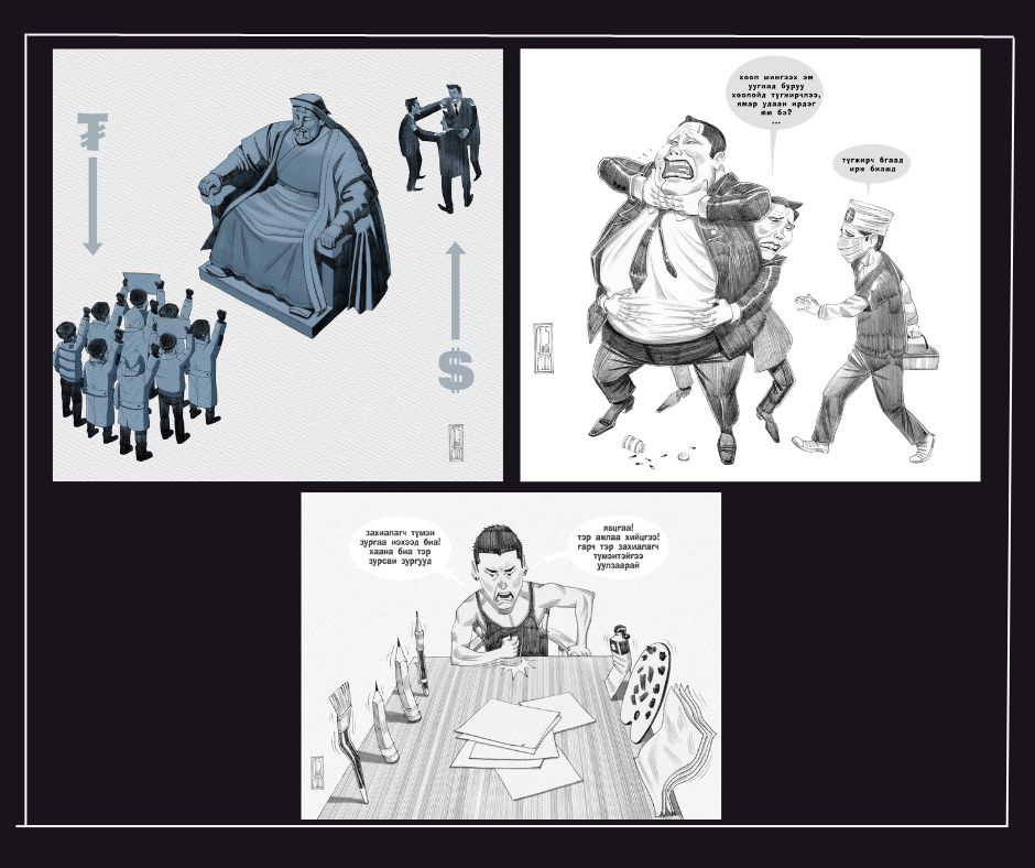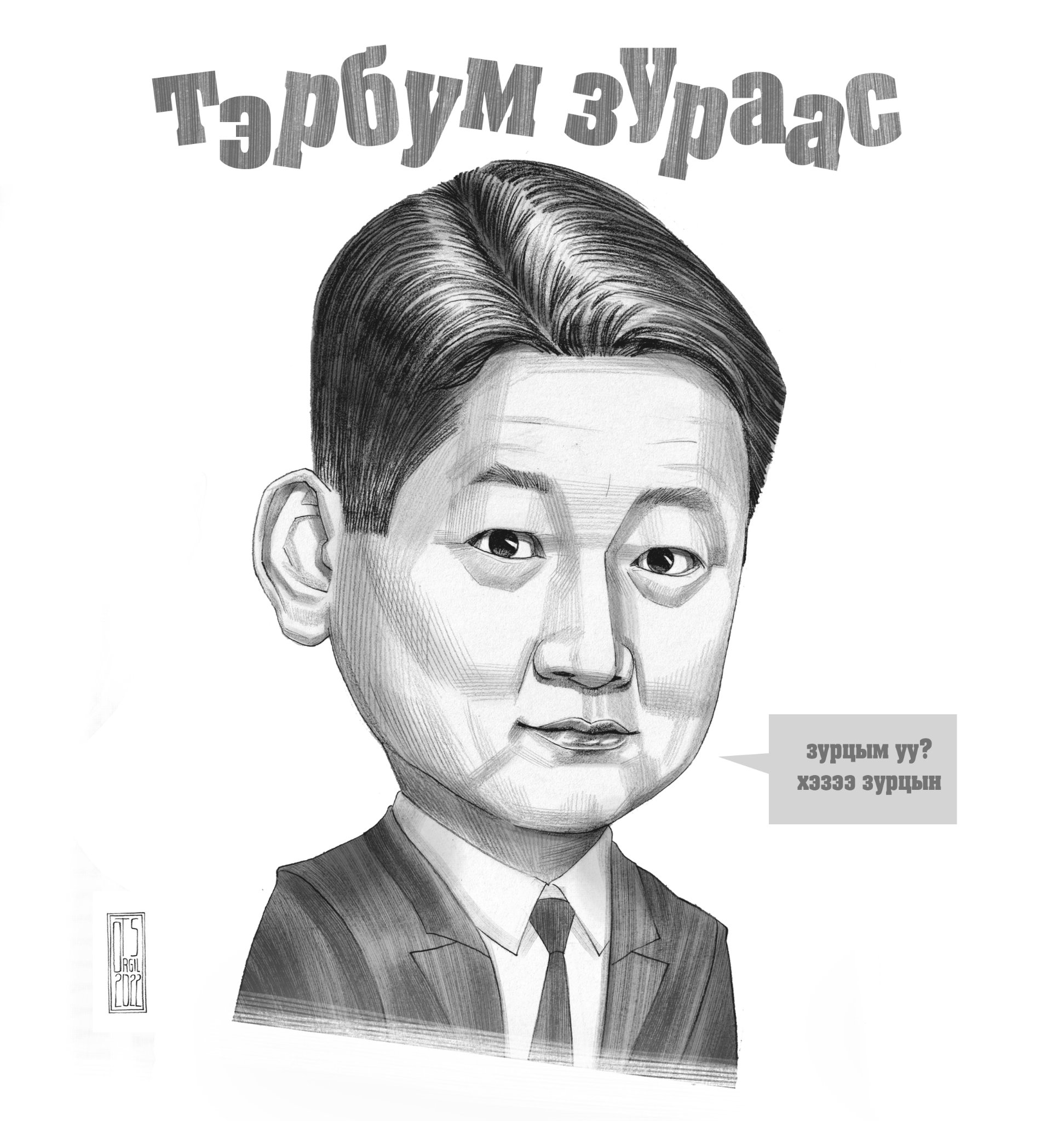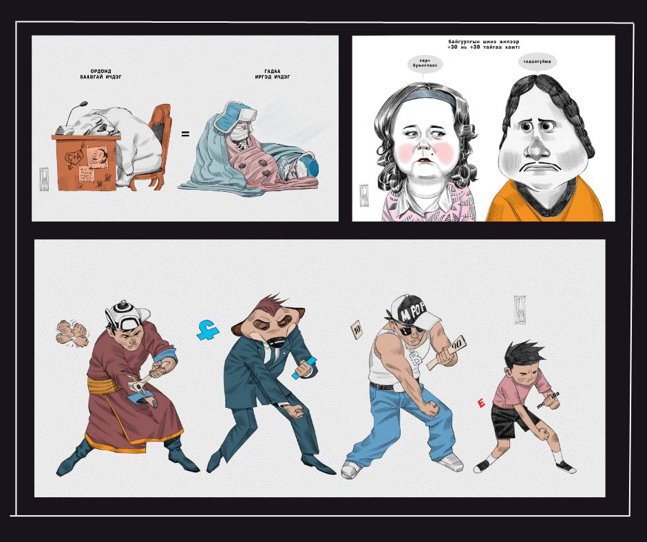 Түүний зурагт гүзээтэй том дарга, нүүрсний хулгайтай нэр холбогдсон эрхмүүд, утааг багасгах арга шийдлээ олж чадахгүй болохдоо "Салхи гарвал утаа арилна" гээд хээв нэг хэлээд зогсож байгаа Хот хариуцсан сайд, өнөө алдарт их наядын дээрэм, юуны ч хамаагүй сайд болоход тэврэлдэж, үнсэлддэг эрхмүүд, "Ордондоо баавгай ичдэг, гадаа иргэд ичдэг" гэх ордон дотор суугаа сайд дарга, гадна талбайд жагсаж байгаа иргэдийн нөхцөл байдал, улс төр, нийгмийн өнөөгийн өнгө төрх, дарга даамал нарын ичгүүргүй дүр байдал ёстой тэр хэвээрээ, өнөө л янзаараа буужээ. Үнэндээ бид дотор, гаднагүй ийм л болсон. Хүмүүс ч үнийн өсөлт, утаа, түгжрэл, үйлчилгээ, харилцаа муутай эрүүл мэндийн салбар гээд ам дамжин ярьж, хангалттай бухимдаж байгаа. Тэгвэл харандааныхаа үзүүрээр цагаан цаасан дээр өнөөгийн цаг үеийн байж байгаа царайг хоржоонтойхон буулгачихаад, хөнгөхөн өөртөө инээчихээд, цахим хуудсаараа дамжуулан хүргээд буй нэгэн уран бүтээлч бий.
