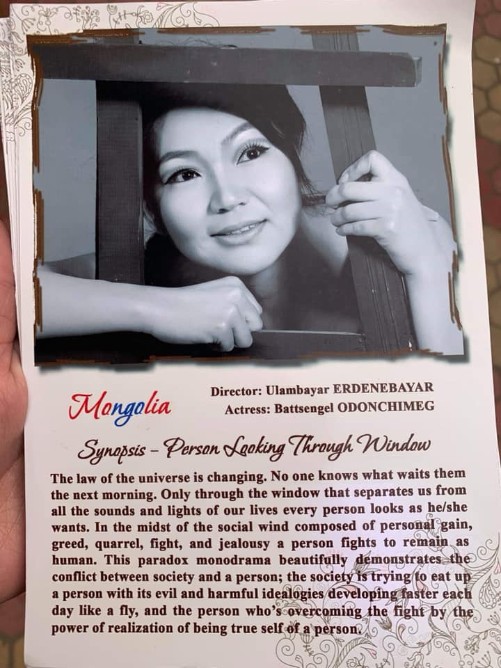 Нэгэнт тайзны бүтээлийнх нь тухай өгүүлснийх түүний нэг хүний моно жүжгийн тухай ярихгүй өнгөрч болохгүй. Анх түүнд Б.Баатар найруулагч яруу найрагч Д.Урианхайн “Цонхоор харсан хүн” гэх моно жүжгийн дүрд тоглох санал тавьж байжээ. Эл жүжгээрээ тэр олон улсын фестиваль амжилттай оролцсныг уншигчид андахгүй мэднэ байх. Түүгээрээ олон улсын нэг хүний жүжгийн нэрэмжит шагнал хүртсэн. Мөн Энэтхэгийн Колкота хотод зохион байгуулагдсан JOURNEY театрын "International Theatre-2019" олон улсын наадмын ганц хүний жүжгийн төрөлд оролцож тэргүүн байр эзэлсэн. Ингэж тэр моно жүжгээр чамгүй хол давхиж, өөрийнхөө барьж авсан бүтээлийг үнэ цэнд хүргэж чадсан авхаалжтай нэгэн. Тэгэхээр түүнийг эл жүжгээс салгах аргагүй бөгөөд тэр өөрөө урлаг хэмээх байшингийн дотор амьдрагч нэгэн. Тэндээс ертөнцийн цонхоор харж байгаа уран бүтээлч мөн юм.