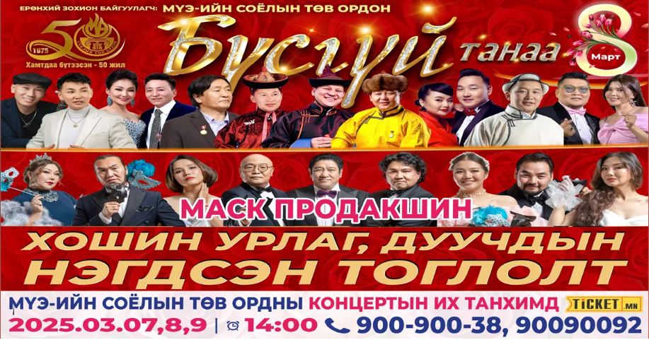 Ардын болон Гавьяат жүжигчид, дуучдын нэгдсэн эмэгтэйчүүдийн баярт зориулсан уламжлалт тоглолт 25 дахь жилдээ тоглоно. Тоглолтод МУАЖ С.Батсүх, МУАЖ Ш.Чимэдцэеэ, МУАЖ Д.Жаргалсайхан, МУГЖ Б.Сарантуяа, МУГЖ Ж.Уранчимэг, МУГЖ У.Далантай, С.Эрдэнэцэцэг, МУГЖ Ч.Бат-эрдэнэ, МУГЖ Д.Отгонжаргал, МУСТА Л.Банзрагч, СТА Г.Эрдэнэчимэг, СТА Б.Алтанжаргал, СТА Л.Сөрөлт, А.Түмэн-өлзий, СТА Л.Нарангэрэл, СТА Б.БОЛД, Х.МӨНГӨНЦЭЦЭГ нар оролцоно.
