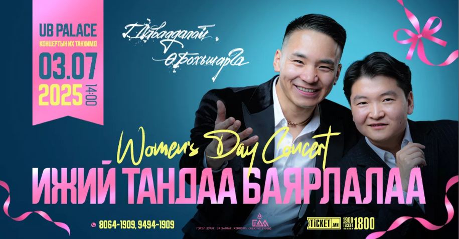 СТА дуучин Г.Даваадалай, СТА дуучин Ө.Бохьшарга нарын хамтарсан "Ижий тандаа баярлалаа" тоглолт 2025 оны 3 дугаар сарын 7-ны өдөр 14:00 цагт UB паласын концертын танхимд ганцхан удаа тоглоно.