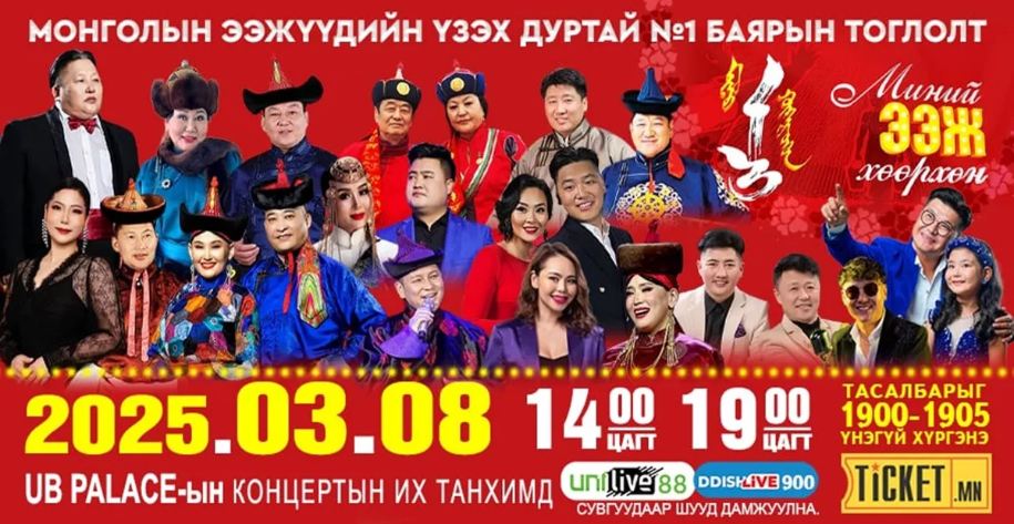“Миний ээж хөөрхөн” баярын тоглолт болно. Энэхүү тоглолт нь Монголын ээжүүдийн үзэх дуртай баярын тоглолтын нэг бөгөөд энэ ч жил мөн онцгой уран бүтээлчид оролцож үзэгчдэд дурсамж дүүрэн үдшийг бэлэглэхээр төлөвлөжээ.