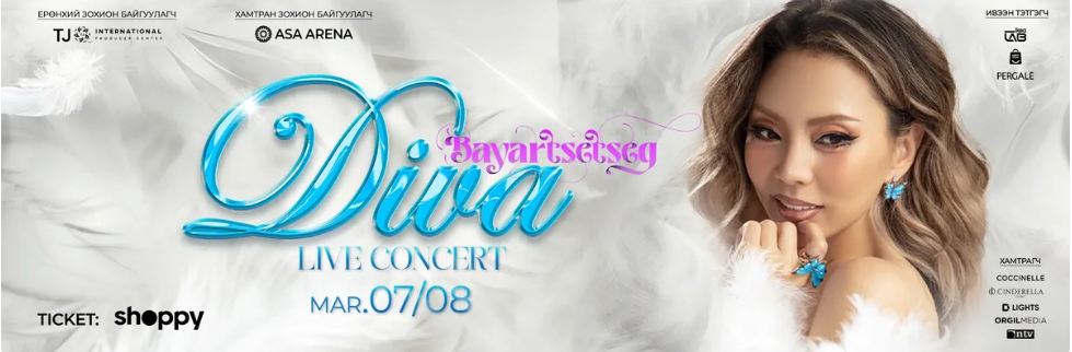 Уянгалаг дуу хоолойтой дуучин Б.Баярцэцэг “DIVA” нэртэй бие даасан тоглолтоо хийх гэж байна. Өөрийн шилдэг уран бүтээлүүдээ тоглохоос гадна урилгаар ICE TOP хамтлаг, LIMIT KING, Анир поп оркестра, дуучин Наагий нар оролцоно.