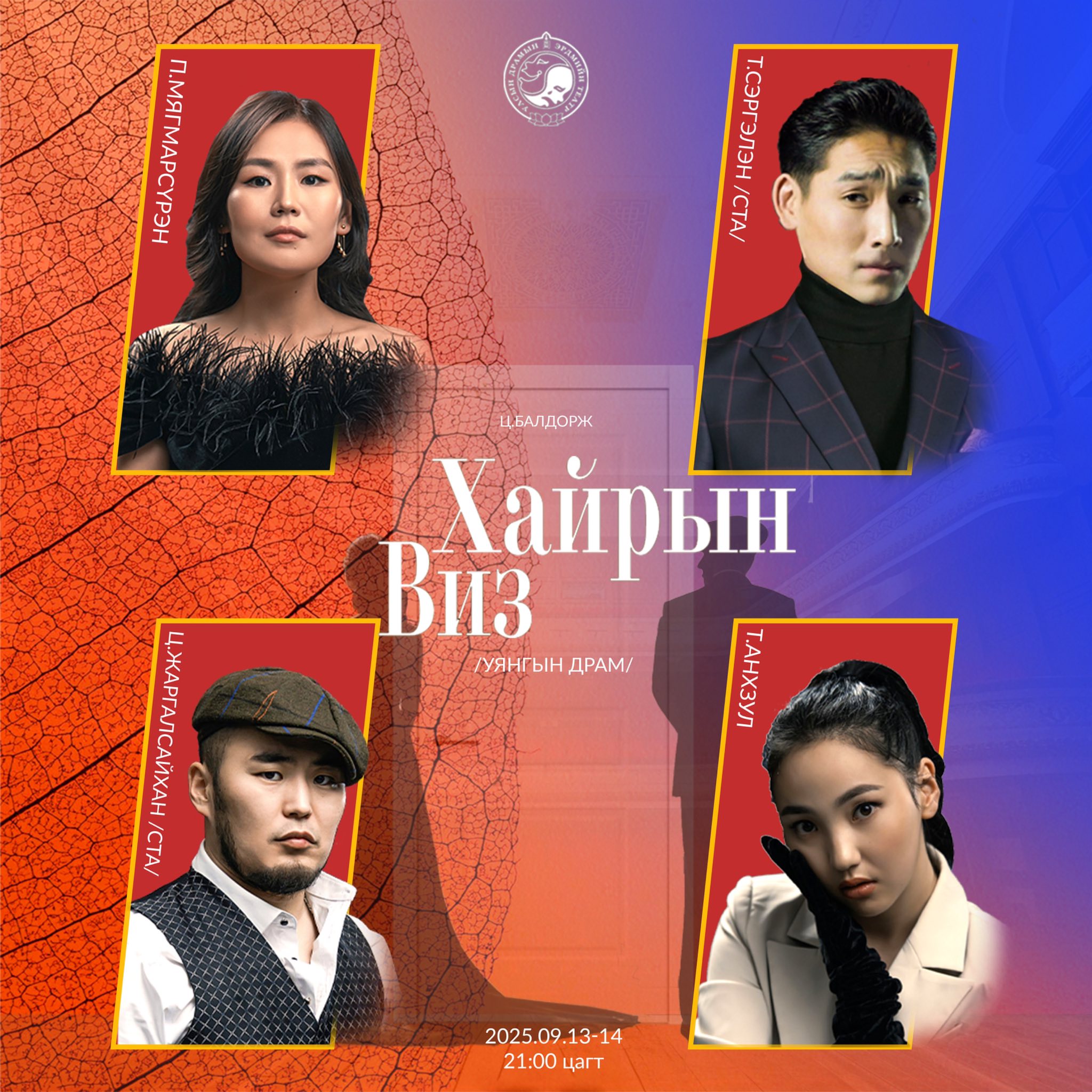 Улсын драмын эрдмийн театрын уран бүтээлчид сэтгүүлч Ц.Балдоржийн зохиол "Хайрын виз" уянгын драмын жүжгийг энэ амралтын өдрүүдэд 21:00 цагаас тоглохоор товложээ. Тус жүжгийн дүрүүдэд, жүжигчин Т.Сэргэлэн, П.Мягмарсүрэн, Ц.Жаргалсайхан, Т.Анхзул нар тоглох байна.