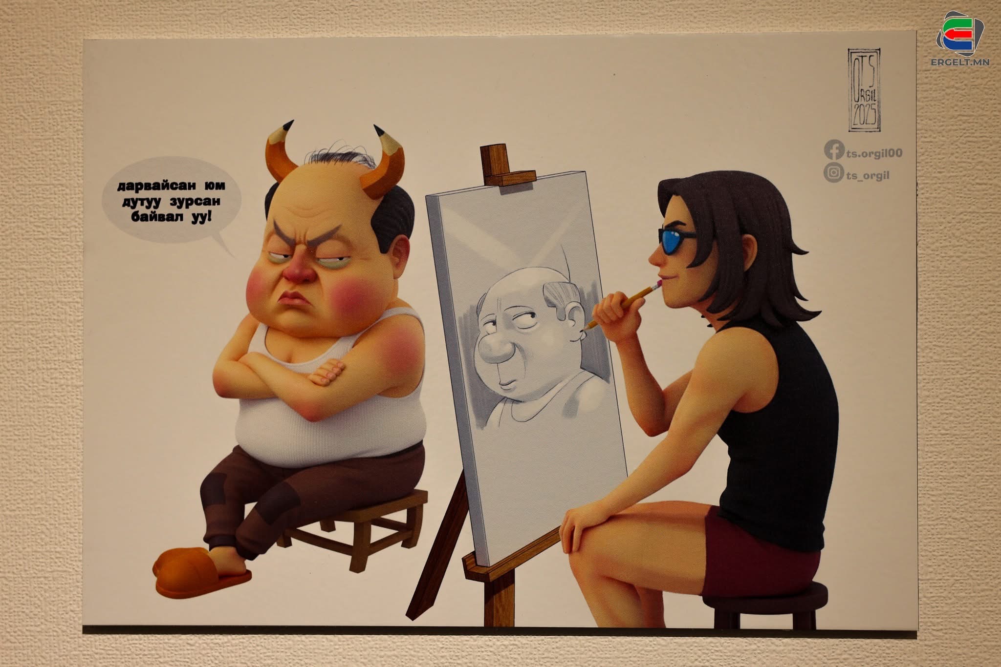 Монгол хүүхдүүд, баатрууд, өв соёл шингэсэн байх юм, түүний үзэсгэлэнд. Гэхдээ энэ бүхнийг инээд хөгжөөнтэй шог зургаар үзүүлсэн нь сонирхолтой санагдана. Ц.Оргил зураачийг бид ихэвчлэн даварч, томорсон дарга нар, ихэмсэг ямбат эрх мэдэлтнүүдийн байр байдлыг егөөдсөн шог зураач гэж мэддэг бол түүнд оюун санаа, сэтгэл зүрхээ нэрсэн, бодож санадагаа хүргэхийг зорьсон цөөнгүй сайхан бүтээл бийг өнгөрсөн зургаан өдөр дэлгэсэн үзэсгэлэнгээс нь мэдлээ, үзлээ. Мэдээж өнөөх том гүзээт тонтгор дарга нар ч дэлгэгджээ.