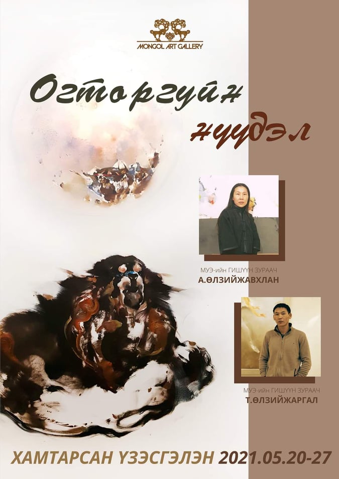 Монгол арт галерей шинэ үзэсгэлэнгүүдээ толилуулахад бэлэн болжээ. Тус галерэйгаас санаачилсан “Монгол арт роад” төслийн хүрээнд ахмад, дунд, залуу үеийн төлөөлөл болсон зураач, түүх судлаачдын баг бүрэлдэхүүн Хэнтий аймгийн нутгаар 2500 км, замыг туулан уран бүтээлийн судалбар аялал хийсэн билээ. Энэхүү аяллын тайлан болгож "Их хааны нутгаар" хэмээх хамтарсан үзэсгэлэнг энэ сарын 20-ны өдөр зохион байгуулах гэж байна. Мөн хөл хорионы хугацаанд зураач, уран бүтээлчид олон шинэ уран бүтээл төрөн гарч байгаагийн нэг нь "Огторгуйн нүүдэл" хэмээх Нүүдэлчдийн соёл, Монголчуудын язгуур аж төрөхүйг уран бүтээлдээ тусган илэрхийлдэг МУЭ-ийн гишүүн зураач Т.Өлзийжаргал, А.Өлзийжавхлан нарын хамтарсан ээлжит үзэсгэлэнгээ Монгол Арт галерейд энэ сарын 20-27-нд толилуулах аж.