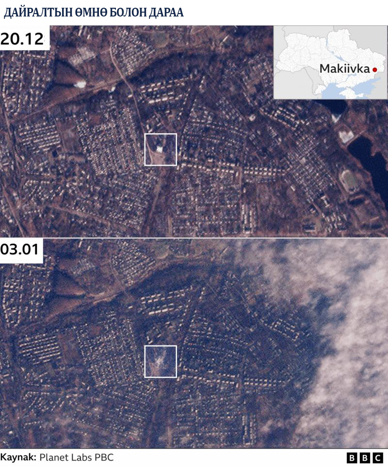 Оросын Батлан хамгаалахын яамнаас “Украины Донецк мужид өрнөсөн пуужингийн дайралтад 63 цэрэг өртөж амиа алдсан” хэмээн мэдэгдсэн. Батлан хамгаалах яамны ажилтан Игор Конашенков “Цэргүүдийн түр байрлаж байсан сургууль руу хөөргөсөн АНУ-д үйлдвэрлэгдсэн HIMAR пуужингийн дөрөв нь Макиевка хотын ойролцоох сургуулийн барилгыг оносон, хоёр пуужинг замд нь устгасан” хэмээн мэдэгдэлдээ онцолсон юм. Ройтерс мэдээллийн агентлаг, Рибар нэрээр танигдсан орос цэргийн блогийн нийтлэлд энэхүү дайралтад 100 гаруй цэрэг өртсөн гэсэн юм. Түүнчлэн Рибар “Дайралтын үед барилга дотор 600 хүн байсан. Тухайн сургуулийн барилгыг зэр зэвсэг хадгалах зорилгоор ашиглаж байсан” гэж дурджээ.