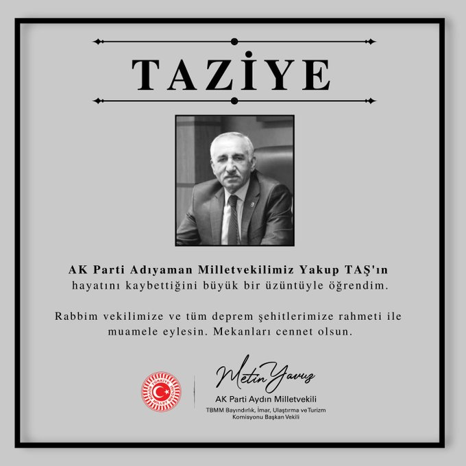 БНТУ-ын Парламент болон эрх баригч Шударга ёс, хөгжлийн намын гишүүн Якуп Таш Адьяман мужид болсон газар хөдлөлтийн улмаас нурангид дарагдан амиа алджээ. Тэрээр 1959 оны зургадугаар сарын 16-нд Адьяман мужид төрж, төрөлх мужаасаа 27 удаа Шударга ёс, хөгжлийн намын депутатаар сонгогдож, 2018 оны сонгуулиар Парламентын гишүүнээр сонгогдон ажиллаж байсан аж. Якуп Таш нь эхнэр, зургаан хүүхэдтэй бөгөөд холбогдох албанаас гэр бүлийнхэн нь аюулгүйг байгааг мэдэгдээд байна.