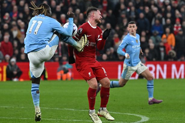 Нөгөө талд өнгөрсөн тойрог Аваргуудын лигийн шигшээ 16-гийн өрсөлдөгчөө бут ниргэж, бага шөвгийн эрхээ өвөртлөөд байсан аваргаа хамгаалагч Английн “Манчестер Сити” клуб Премьер лигийн хүрээнд Анфилд цэнгэлдэхэд зочилж тоглов. Харин гол тоглогчдын бэртэл гэмтлийн асуудалтай холбоотойгоор бүх тэмцээний хүрээнд сүүлийн хэдэн тоглолтдоо академийн тоглогчдоо түлхүү ашиглаж байгаа “Ливерпүүл” клуб өнгөрсөн жилийн аваргуудыг талбайдаа хүлээн авч тоглосон тоглолтдоо бэртлээс эргэн ирсэн гарааны гол тоглогчдоо сэлгээнээс оруулж тоглов. Премьер лигийн 28 дугаар тойргийн оргил тоглолтын 23 дахь минутад “Манчестер Сити” клубийн төвийн хамгаалагч Жон Стонес “Ливерпүүл” клубийн хаалганд мөргөж гоолын харьцааг эхлүүлсэн. Улмаар тоглолтын хэмнэлийг гартаа атгаад байсан ч хоёрдугаар хагас эхлээд удаагүй байхад эсрэг багтаа торгуулийн цохилт өгснөөр “Ливерпүүл” клубийн аргентин хагас хамгаалагч МакАллистер торгуулийн цохилтоор гоолдож, тооны харьцааг тэнцүүлсэн юм.