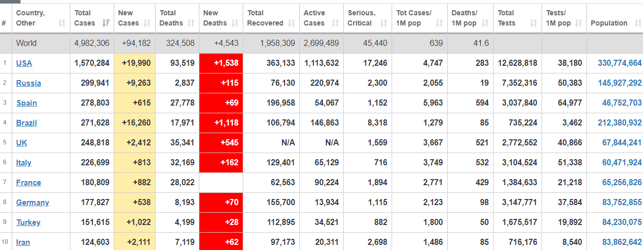 Дэлхий дахинд сүүлийн 24 цагийн хугацаанд шинэ төрлийн коронавирус буюу covid-19 өвчний 94 мянга гаруй шинэ тохиолдол бүртгэгдэж, 4543 хүн уг өвчнөөр нас баржээ. Ингэснээр нийт халдвар авсан хүний тоо 4,982,306 болж, нас барагсдын тоо 324 мянга давсан байна. Харин нийт эдгэрсэн хүний тоо 1958309 болжээ. Үүнээс цар тахалд хамгийн их нэрвэгдсэн АНУ-д хоногт 15 мянга гаруй шинэ тохиолдол нэмэгдэж, 1538 нас баралт шинээр бүртгэгдэж, тус улсад нийт халдвар авсан хүний тоо 1,5 сая давсан бол нас баралт 93 мянга давсан байна. Харин ОХУ-д хоногт 9,263 шинэ тохиолдол, 115 нас баралт бүртгэгдэж нийт халдвар авагсдын тоо 299 мянга давжээ. Дэлхий даяар нийт идэвхтэй халдварын тохиолдлын тоо 2,699,489 байгаа бол тэдгээрийн 45 мянга гаруй нь биеийн байдал хүнд байна. Нэг сая хүнд ногдох халдварын тоо 639 байгаа бол сая хүн тутмын 41 нь коронавирусийн улмаас нас барсан байна. Мөн Ислани улсын хувьд нйит тохиолдол нь 278803 болж шинэ тохиолдол нь 615 –аар нэмэгдсэн байн. Нас баралт өмнөх өдөр 87 байсан бол өнөөдөр 69 болж нийт 18 тохиолдлоор буурсан байна.