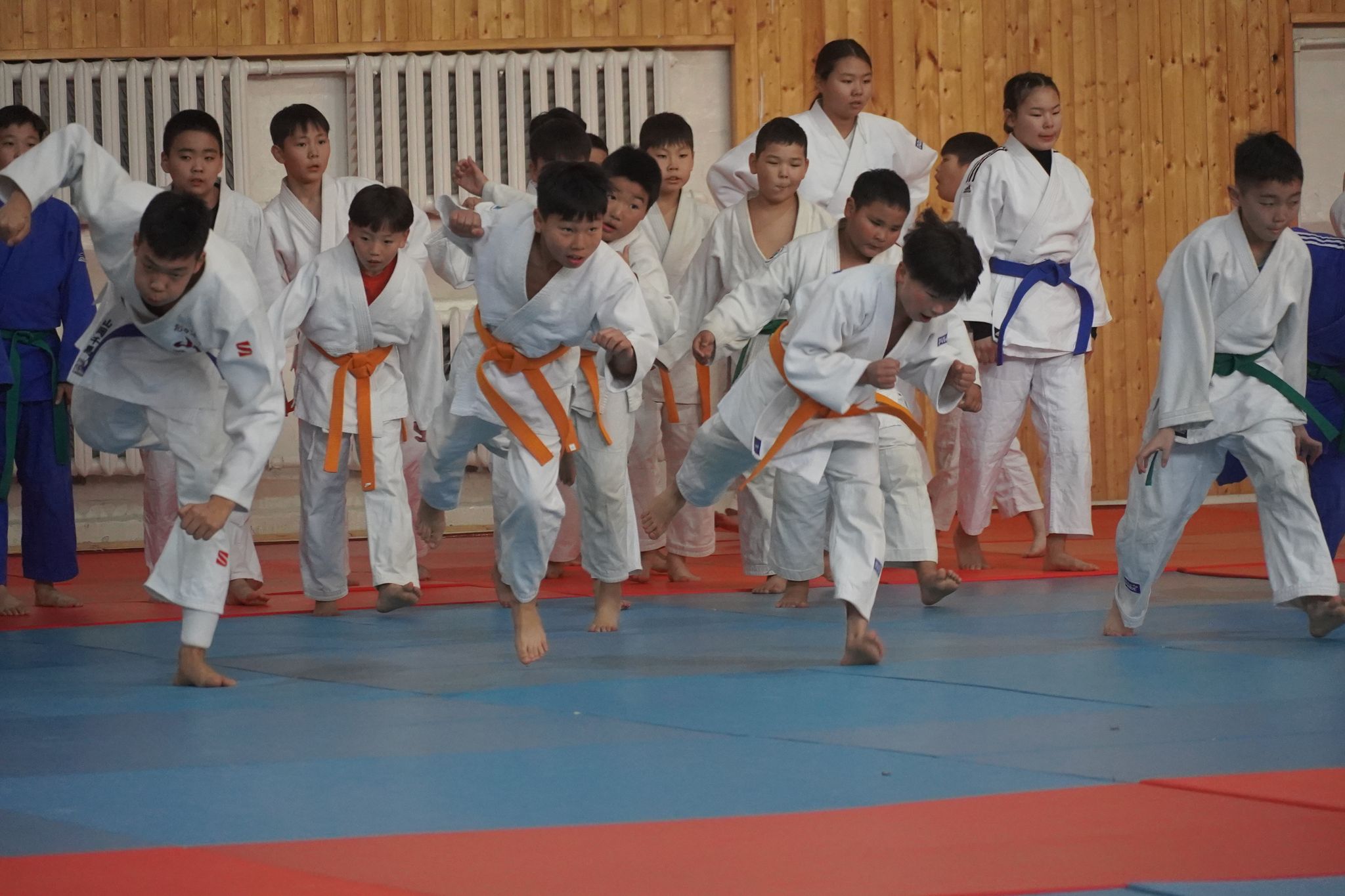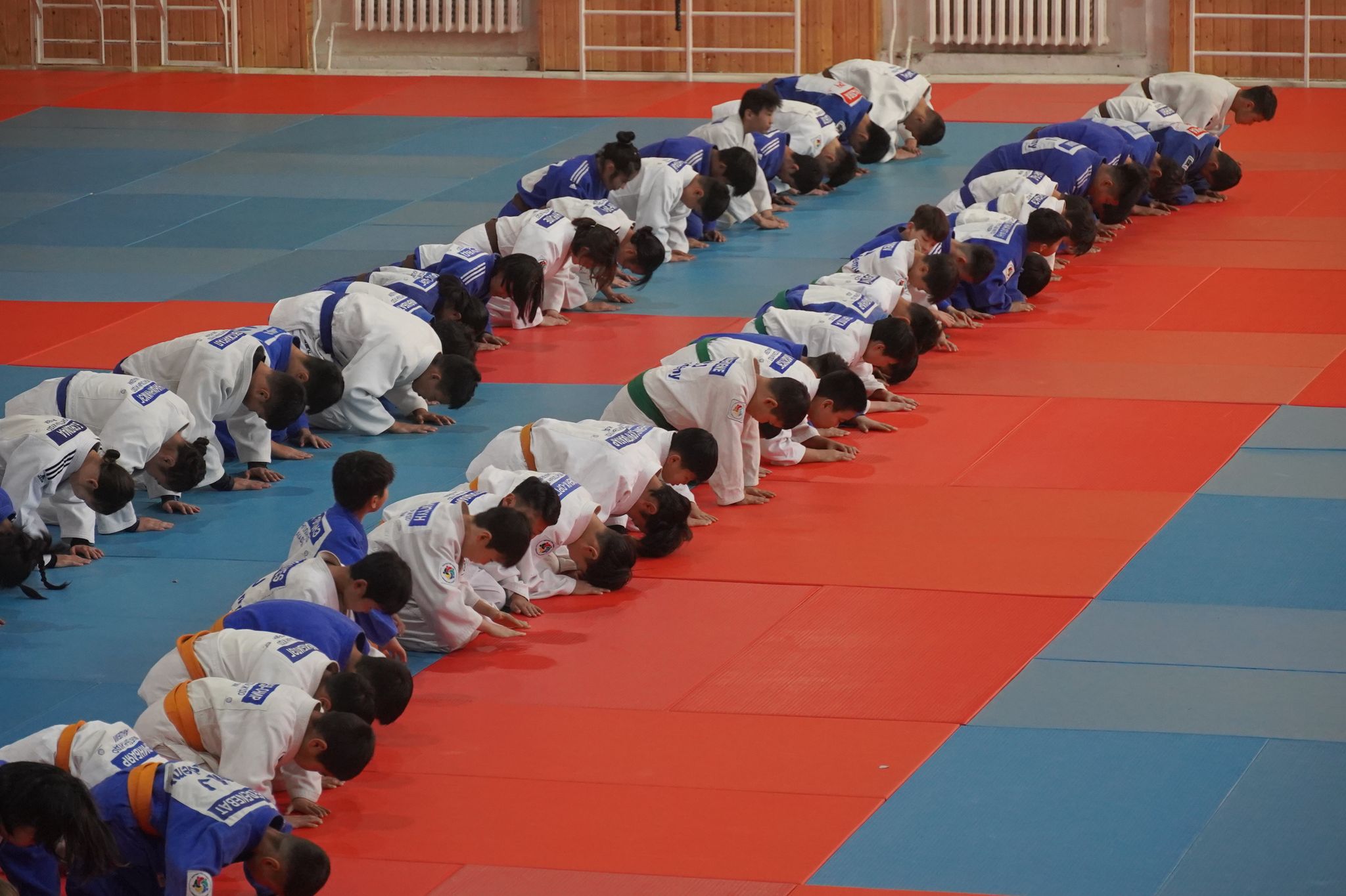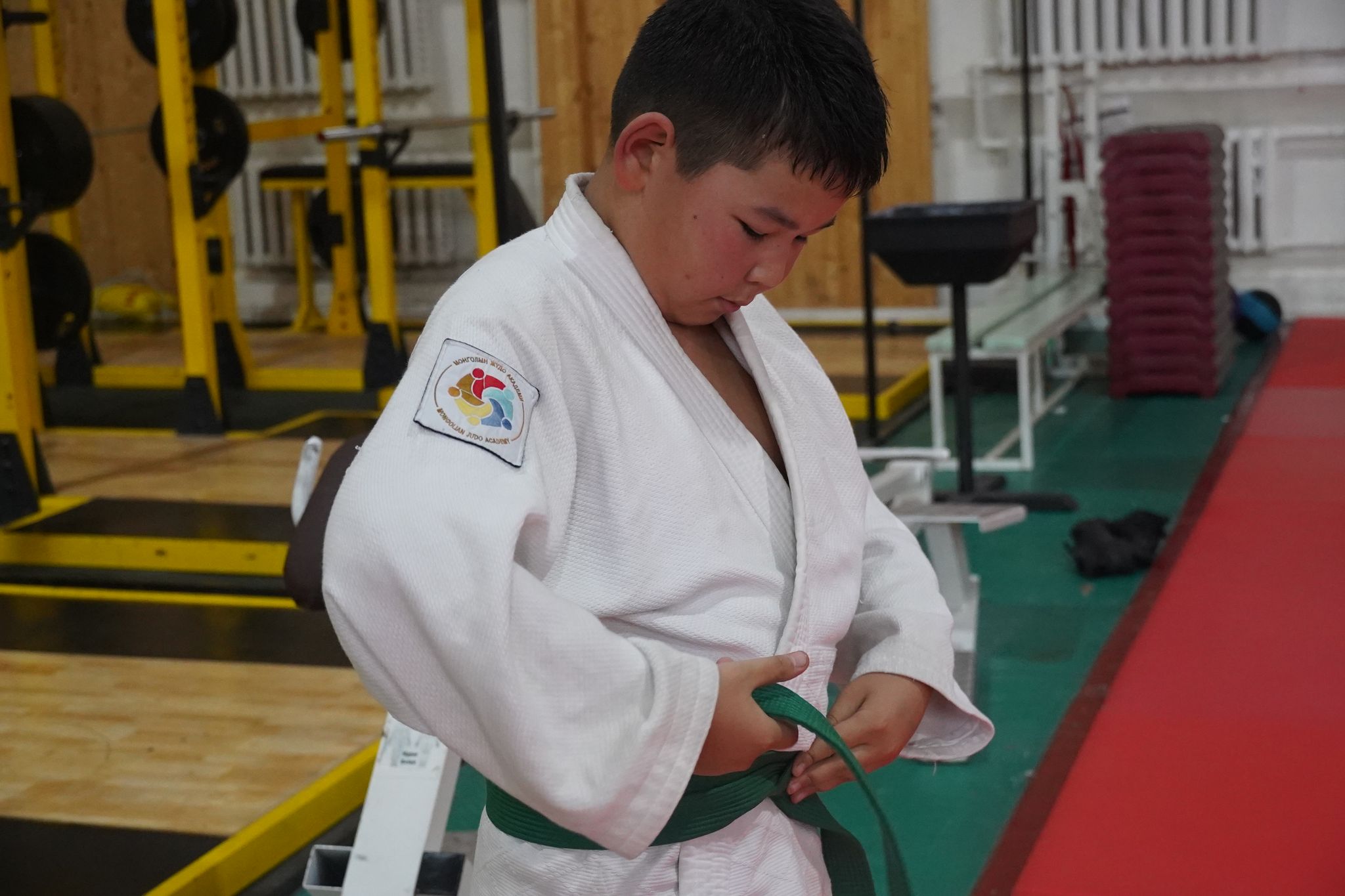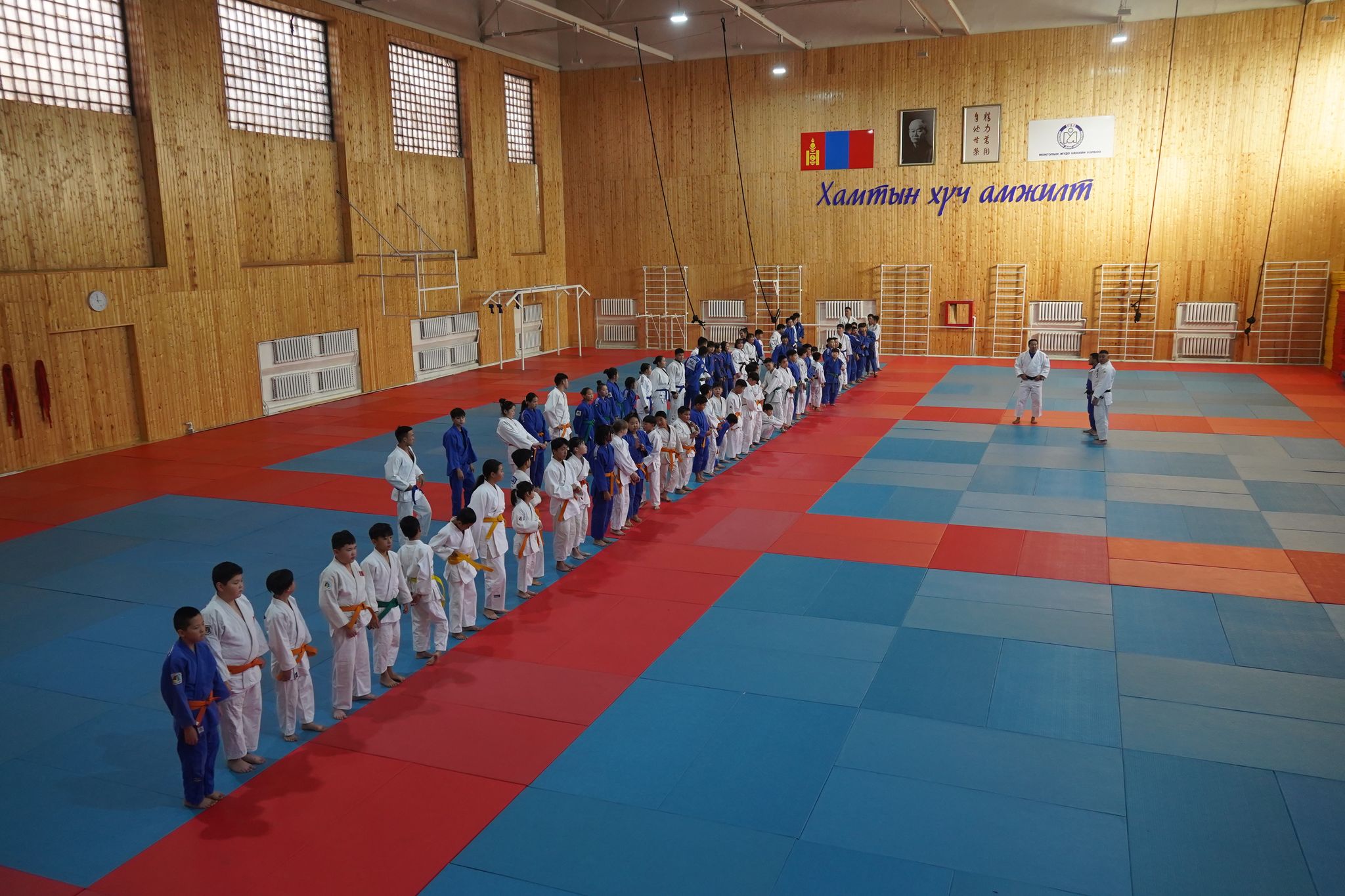 Спортын төв ордны үүдээр гурван цагаас урьтаж, бэлтгэл рүүгээ яарах хүүхдүүдтэй зэрэгцэн орлоо. Бэлтгэлийн заалны үүдэнд багш нь хүүхдүүдээ угтаж, “Сайн байна уу” гэсээр мэндлэх аж. Өнөөх хүүхдүүдийн адил багштай мэндлээд цааш ороход багш нарынхаа өөд эгцлэн ширтэх 100 гаруй хүүхэд бэлтгэлд хэдийн бэлэн жигсажээ. Энэ үед хамгийн сүүлд ирсэн бяцхан хүү багш болгонд хүндэтгэн ёслоод жигсаалын ард оров. Ингээд гурван цаг болоход хүүхэд, багш нар өвдөг дээрээ сөхөрч суугаад дэвжээндээ хүндэтгэл үзүүлэв. Ингэхдээ хэн нь ч илүү хөдөлгөөн хийсэнгүй. Дэггүй гэмээр бяцхан хүүхдүүд ч суусан газраасаа хазайсан ч үгүй төвлөрч байх нь хүүхдүүд спортоор хэрхэн хүмүүжиж байгаа нь илт. Монголын жүдо академи дөрвөн салбарт үйл ажиллагаагаа явуулж байгаагийн нэг нь Спортын төв ордон дахь клуб юм. Харин өнөөдөр нийт таван багш, дасгалжуулагч, 100 гаруй хүүхдийн хамт бэлтгэлдээ гарсан нь энэ. Ёс зүй, дэг журам бүгдэд эрх тэгш үйлчилж зааланд буй хүн бүртэй хүндэтгэлтэй харьцаж, цаг баримтлалыг чанад хэрэгжүүлдэг гэнэ. Дасгалжуулагчид хүүхэд нэг бүрт анхаарал хандуулж, хурц шийдэмгий байдлыг нь улам ирлэнэ. Ийм байдлаар бие халаалт үргэлжилж, барилдааны бэлтгэл эхэллээ.