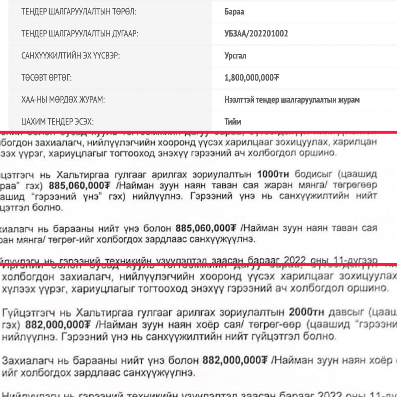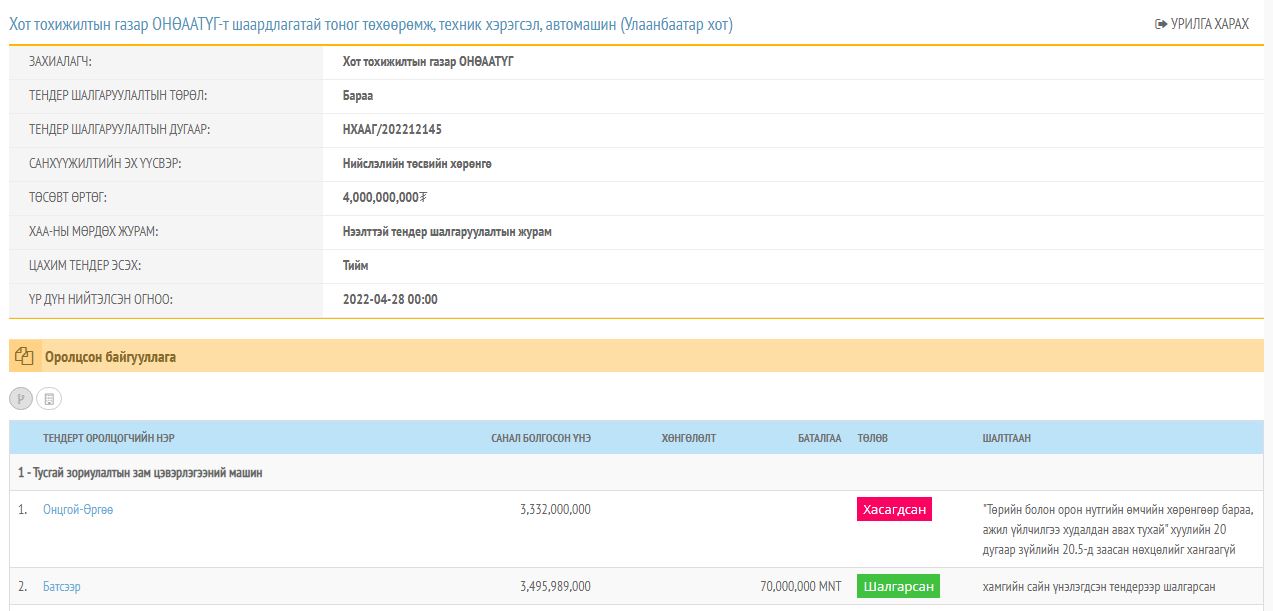 Хот тохижилтын газар ОНӨААТҮГ-т шаардлагатай тоног төхөөрөмж, техник хэрэгсэл, автомашин худалдан авах тендер буюу дөрвөн тэрбум төгрөгийн нээлттэй сонгон шалгаруулалт зарлаж, 2022 оны дөрөвдүгээр сарын 28-нд үр дүнг танилцуулсан байгаа юм. Уг тендерт “Онцгой өргөө”, “Батсээр” ХХК өрсөлдөж, “Онцгой өргөө” ХХК "Төрийн болон орон нутгийн өмчийн хөрөнгөөр бараа, ажил үйлчилгээ худалдан авах тухай" хуулийн 20 дугаар зүйлийн 20.5-д заасан нөхцөлийг хангаагүй гэх үндэслэлээр сонгон шалгаруулалтаас хасагджээ. Улмаар “Батсээр” ХХК 3.4 сая төгрөгөөр бульдозер нийлүүлэхээр гэрээ байгуулсан байна.