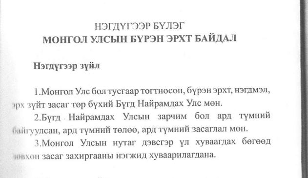 1. Монгол Улс бол тусгаар тогтносон, бүрэн эрхт, нэгдмэл эрх зүйт засаг төр бүхий Бүгд найрамдах улс мөн