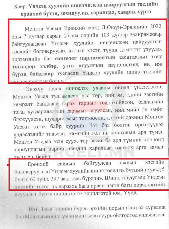 БНХАУ-ын Үндсэн хуулийн шинэчилсэн найруулгын төсөлд Монгол Улсын Ерөнхий сайд Л.Оюун-Эрдэнийн 2022 оны долдугаар сарын 27-ны өдрийн 109 дүгээр захирамжаар байгуулагдсан Үндсэн хуулийн шинэчилсэн найруулгын төслийг боловсруулах ажлын хэсэг, түүнд дэмжлэг үзүүлэх эрдэмтдийн баг сонгодог парламентын засаглалыг төгс төгөлдөр хэлбэр, утга агуулгын шүтэлцээнд нь иж бүрэн байдлаар тусгасан Үндсэн хуулийн шинэ төслийг боловсруулсан болно хэмээн тусгажээ.