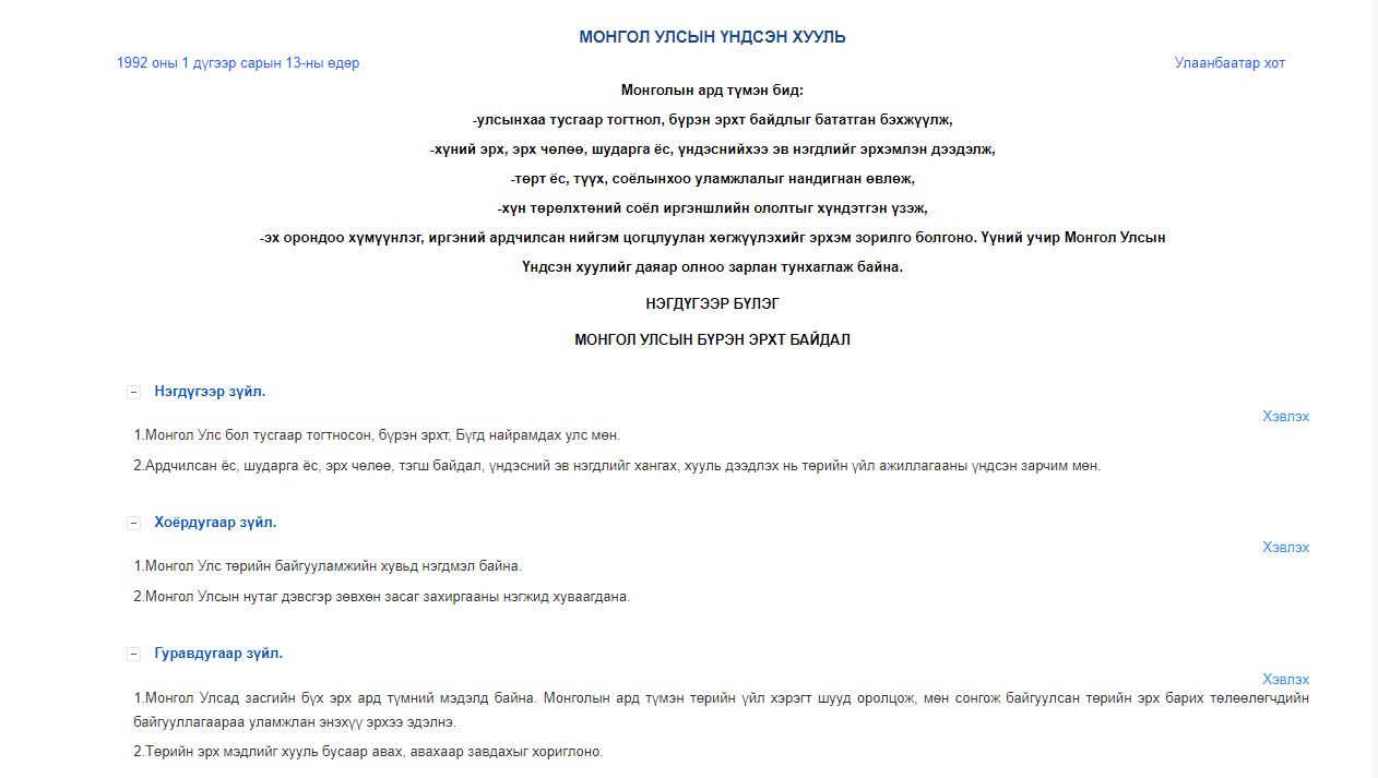 Үндсэн хуулийн нэгдүгээр бүлгийн 1.1, 1.1-т Монгол Улс бол тусгаар тогтносон, бүрэн эрхт, Бүгд найрамдах улс мөн. 1.2.Ардчилсан ёс, шударга ёс, эрх чөлөө, тэгш байдал, үндэсний эв нэгдлийг хангах, хууль дээдлэх нь төрийн үйл ажиллагааны үндсэн зарчим мөн гэснийг