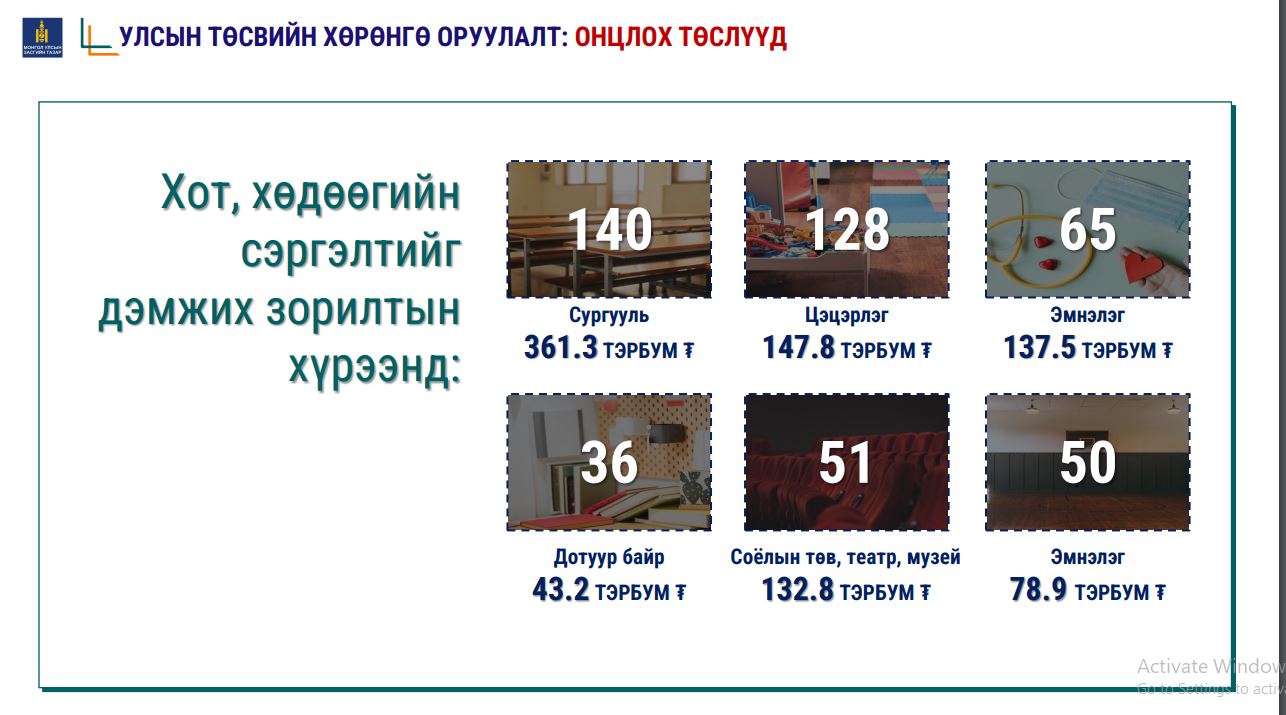 Тодруулбал, Архангай, Өвөрхангай, Баянхонгор, Говь-Алтай, Дундговь, Завхан, Сүхбаатар, Төв, Хэнтий, Говьсүмбэр зэрэг аймагт 130 тэрбум төгрөгийн өртөг бүхий дэд станцийн ажлуудыг ирэх оноос эхлүүлэхээр болжээ. Түүнчлэн хөдөөгийн алслагдсан 191 багийг харилцаа холбоонд холбох ажлыг үүрэг холбооны оперторуудтай хамтарч эхлүүлэх бөгөөд нийт 20 тэрбум төгрөгийг өртөгтэй байхаар төсөвлөөд байгаа юм байна. Түүнчлэн ирэх онд “Шинэ Хархорум” хотын ТЭЗҮ, зураг төслийг боловсруулах ажлыг эхлүүлэхээр 30 тэрбумтөгрөг төсөвлөжээ. Энэ мэтээр хөдөө орон нутагт сургуулт цэцэрлэгийн ажлыг үргэлжлүүлэн, автозам завсар, арчлалт үйлчилгээний хөрөнгө оруулалтыг мөн тусгаад байгаа аж.