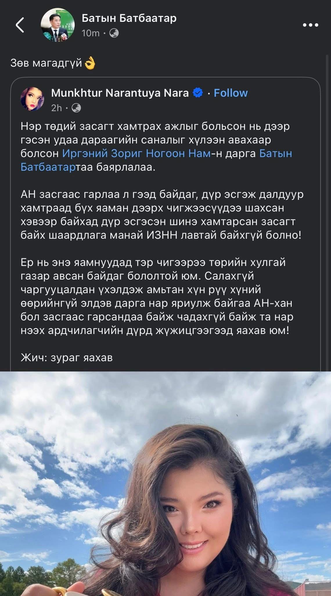 Хэдийгээр Байгаль орчин уур амьсгалын өөрчлөлтийн сайд Б.Батбаатар албан ёсоор энэ асуудлыг яриагүй ч тус намыг УИХ-д төлөөлж суугаа М.Нара-Нарантуяа цахим орчинд “Нэр төдий засагт хамтрах ажлыг больсон нь дээр гэсэн удаа дараагийн саналыг хүлээн авахаар болсон Иргэний Зориг Ногоон Намын дарга Батын Батбаатартаа баярлалаа. АН засгаас гарлаа л гээд байдаг, дүр эсгэж далдуур хамтраад бүх яаман дээрх чигжээсүүдээ шахсан хэвээр байхад дүр эсгэсэн шинэ хамтарсан Засагт байх шаардлага манай ИЗНН лавтай байхгүй болно” хэмээн мэдэгдсэн. Улмаар түүний энэ мэдэгдлийн Байгаль орчин уур амьсгалын өөрчлөлтийн сайд Б.Батбаатар цахим орчинд дэмжиж байгаагаа илэрхийлсэн удаатай.