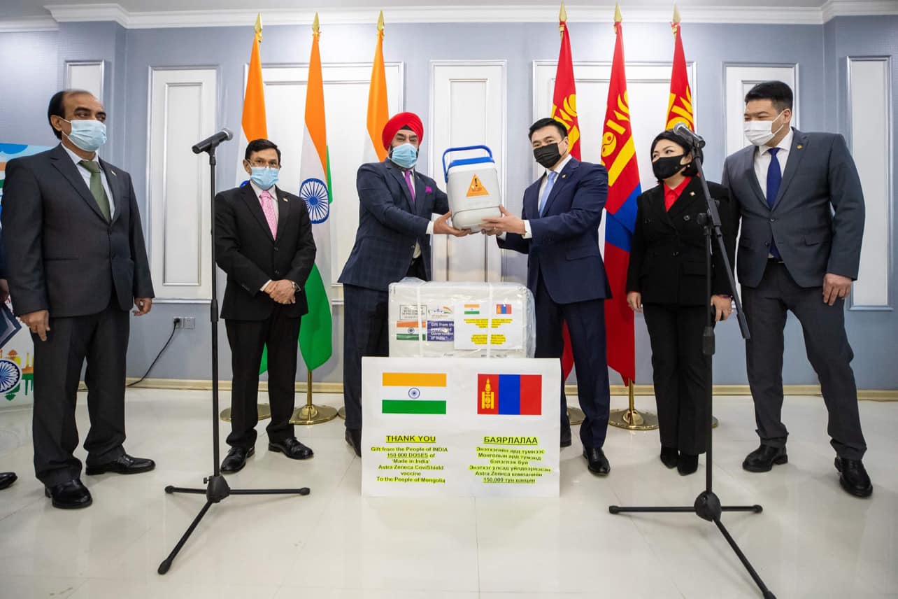 Энэтхэг Улсаас буцалтгүй тусламжаар олгож буй “АстраЗенека” вакцины эхний таталт болох 150 мянган тунг хоёрдугаар сарын 22-ны өглөө манай улс хүлээж авав. Тус вакциныг хоёр тунгаар 28 хоногийн хугацаатай, нэг удаагийн тариураар 0.5 мл-ээр тарих юм. Эдийн засгаа чөлөөлж, хөл хориог цуцалсан өдөр буюу хоёрдугаар сарын 23-нд Монгол Улсын Ерөнхий сайд Л.Оюун-Эрдэнэ Улсын хоёрдугаар төв эмнэлэгт “АстраЗенека” вакцины эхний тунг, удаахыг Эрүүл мэндийн сайд С.Энхболд тариулсан.