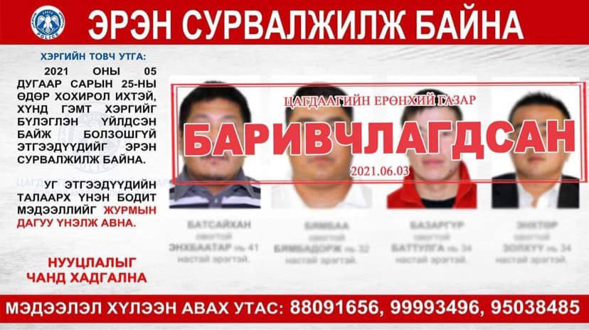Хуурамч бичиг баримт бүрдүүлэн залилсан энэ хэрэгт арав гаруй хүнийг холбогдуулан шалгаж, заримыг нь эрэн сурвалжилж байсан юм. Цагдаа нар 32 настай Б.Бямбадорж, 34 настай Б.Баттулга, Э.Золхүү нарыг Баянзүрх дүүргийн нутаг дэвсгэр дэх түрээсийн орон сууцанд бүгж байхад нь саатууллаа. Харин энэ хэргийг хамт үйлдсэн Батсайханы Энхбаатар гэх 41 настай этгээдийг улс даяар эрэн сурвалжилж байсан юм. Тэгвэл өчигдөр түүнийг иргэдийн мэдээллийн тусламжтайгаар баривчилсан юм. Тус хэрэгт Худалдаа хөгжлийн банкны ажилтнууд ч холбоотой байж магадгүй нөхцөл байдал илрээд байгаа аж.