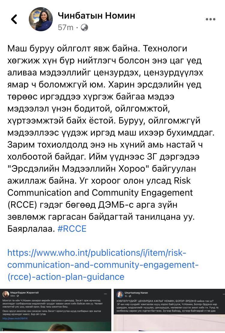 Тэгвэл энэ мэдээлэлтэй холбоотойгоор Соёлын сайд Ч.Номин өөрийн цахим хуудастаа хариу тайлбар хийжээ. Тэрбээр "Маш буруу ойлголт явж байна. Технологи хөгжиж, хүн бүр нийтлэгч болсон энэ цаг үед аливаа мэдээллийг цензурдах, цензурдуулах ямар ч боломжгүй юм. Харин эрсдэлийн үед төрөөс иргэддээ хүргэж байгаа мэдээ мэдээлэл үнэн бодитой, ойлгомжтой, хүртээмжтэй байх ёстой. Буруу, ойлгомжгүй мэдээллээс үүдэж иргэд маш ихээр бухимддаг. Зарим тохиолдолд энэ нь хүний амь настай ч холбоотой байдаг. Ийм үүднээс Засгийн газар дэргэдээ "Эрсдэлийн мэдээллийн хороо" байгуулан ажиллаж байна. Уг хороог олон улсад Risk Communication and Community Engagement (RCCE) гэдэг бөгөөд ДЭМБ-с арга зүйн зөвлөмж гаргасан байдагтай танилцана уу. https://www.who.int/.../risk-communication-and-community..." гэжээ..jpg)