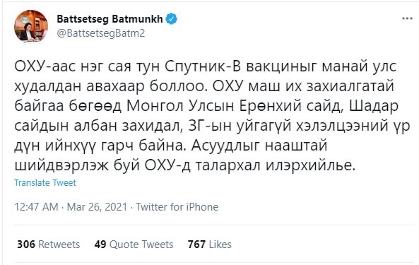 | САЙН МЭДЭЭ: Засгийн газар ОХУ-аас нэг сая тун "СПУТНИК-V" вакцин авах шаардлагатай бичиг баримтуудыг албажуулжээ |