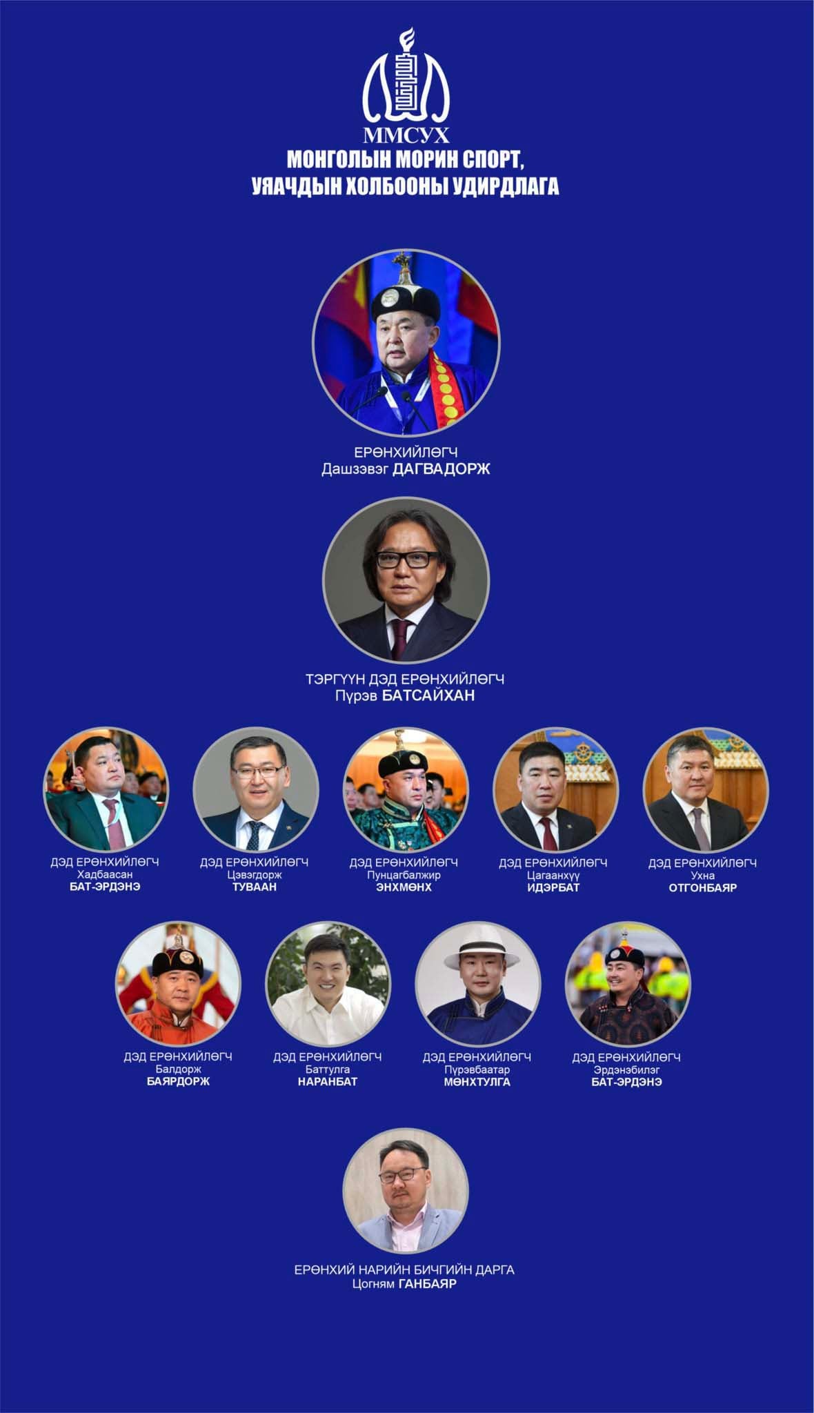 Тухайлбал, ММСУХ-ны Ерөнхийлөгч нь “Тавантолгой транс” ХХК-ийн эзэн Д.Дагвадорж, Тэргүүн дэд ерөнхийлөгч нь “Шунхлай групп” ХХК-ийн эзэн П.Батсайхан, Дэд ерөнхийлөгч нь “Алтай констракшн” ХХК-ийн эзэн Х.Бат-Эрдэнэ, нөгөө Дэд ерөнхийлөгч нь Аж үйлдвэр, эрдэс баялгийн сайд Ц.Туваан.