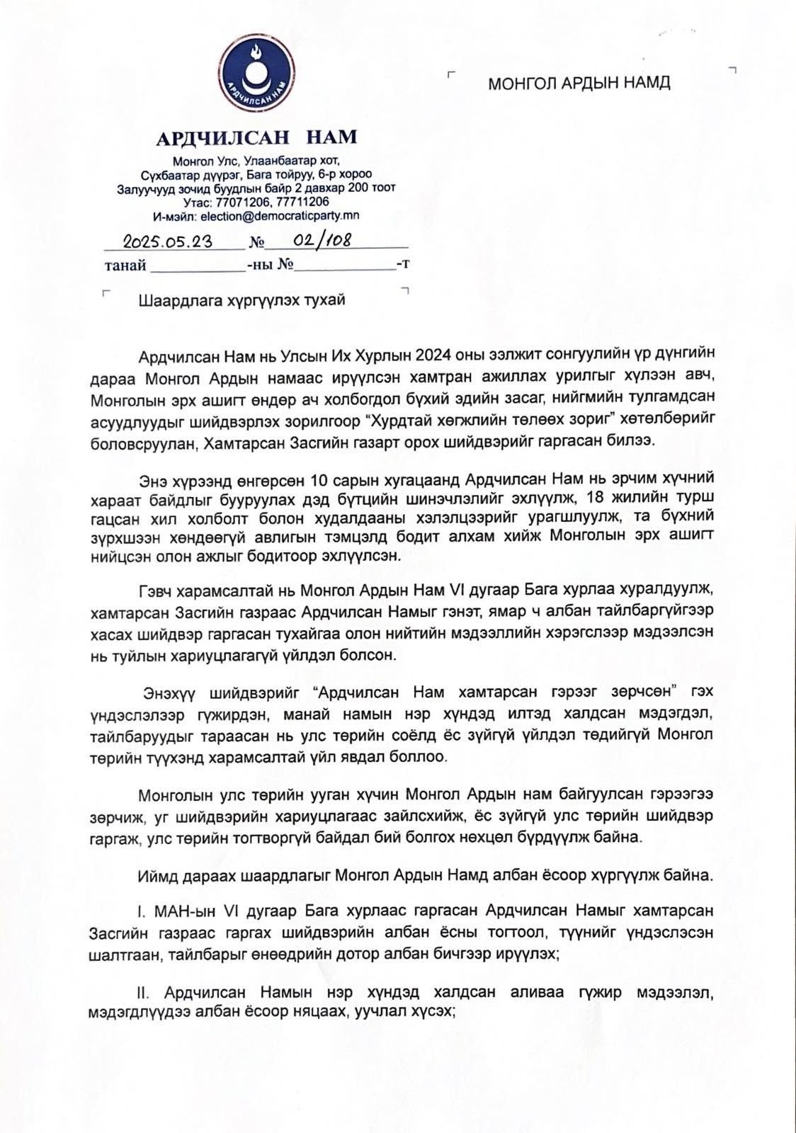 Хэрэв дээрх шаардлагын дагуу албан тайлбар, шийдвэрийн үндэслэлийг ирүүлээгүй тохиолдолд Ардчилсан Нам холбогдох олон нийтэд хандсан дараагийн алхмуудыг хийх болно.