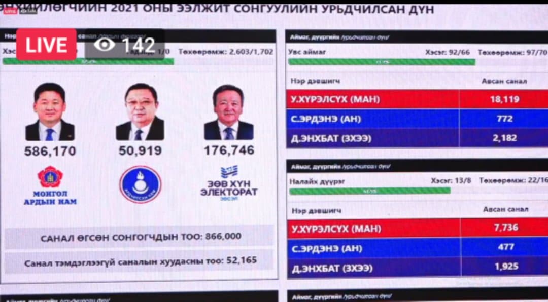 Монгол Улсын найм дахь Ерөнхийлөгчийн сонгуулийн санал хураалт дууслаа.Одоогийн байдлаар саналын хэсгийн хороодын саналыг нэгтгэж байна. Урьдчилсан байдлаар 52 мянган хүн цагаан сонголт хийсэн хэмээн СЕХ-ны ажлын хэсгийн тооллогын комиссоос мэдээллээ. Өөрөөр хэлбэл, 52 мянган иргэн Ерөнхийлөгчийн сонгуульд нэр дэвшсэн гурван иргэнийг сонгоогүй гэсэн үг.