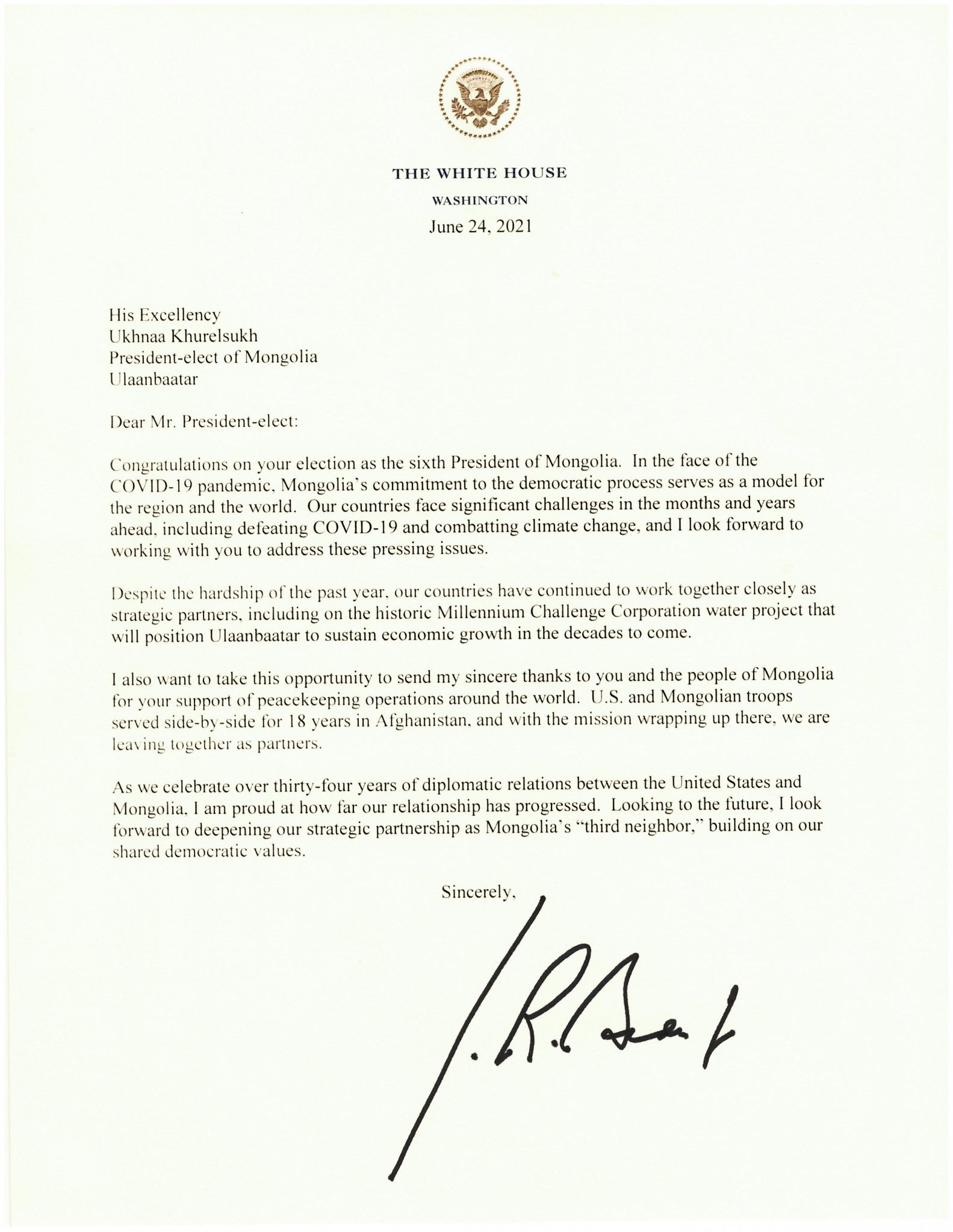 | ЖО БАЙДЕН: Монгол Улсын зургаа дахь Ерөнхийлөгчөөр сонгогдсон У.Хүрэлсүх танд баяр хүргэе |