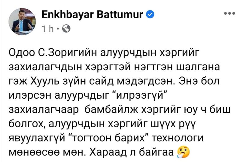 Ингээд зогсохгүй тун саяхан С.Зориг агсны амь насыг хөнөөсөн гэгдэж буй Т.Чимгээ телевизийн ярилцлагад орсны дараа тэрбээр “Одоо С.Зоригийн алуурчдын хэргийг захиалагчдын хэрэгтэй нэгтгэн шалгана гэж Хууль зүйн сайд мэдэгдсэн. Энэ бол илэрсэн алуурчдыг “илрээгүй” захиалагчаар бамбайлж хэргийг юу ч биш болгох, алуурчдын хэргийг шүүх рүү явуулахгүй “тогтоон барих” технологи мөнөөсөө мөн. Хараад л байгаа” хэмээн твиттерт жиргэсэн юм. Үүнийх нь хариуд ХЗДХ-ийн сайд Х.Нямбаатар “Хүн сайд дарга болох хүсэлтэй байж болно. Гэхдээ ингэж гүтгэж дайрч болохгүй. ХЗДХ мөрдөн шалгах ажиллагаа явуулдаггүй. Эцэс сүүлдээ дээрх хэргийг миний бие илрүүлэхгүй тогтоон барьж байгаа гэдэг мессэжийг нийгэмд өгч шүүхээс гэм буруугүйд тооцогдсон хүмүүсийг алуурчин гэж зарлах нь Их хурлын гишүүний бүрэн эрхэд байхгүй гэдгийг хэлье" хэмээсэн юм. Гэсэн ч Б.Энхбаяр "Чимгээ, Содномдаржаа нарыг Улсын дээд шүүхээс гэм буруугүй гэсэн шийдвэр гаргаагүй. “Дахиад шалгаад ир” гэж нэмэлт мөрдөн байцаалтад буцаасан бөгөөд яллагдагч (ял сонссон сэжигтэн) статустай байгаа. Шүүхийн урдуур орж харин "шийдвэр" гаргадаг улстөрчид манайд байгаа нь бол үнэн" хэмээн хариу бариад авсан.
