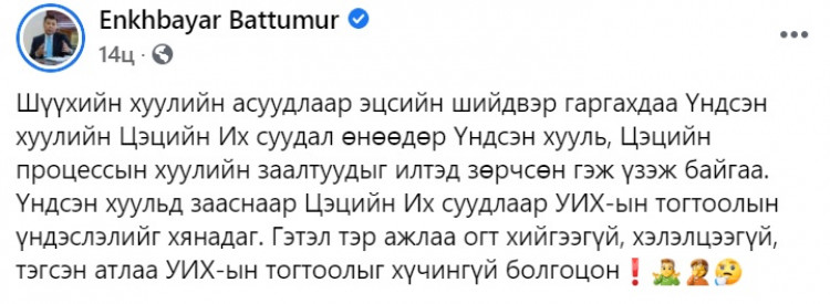 Үүнийг харж суусан Б.Энхбаяр “Шүүхийн хуулийн асуудлаар эцсийн шийдвэр гаргахдаа Үндсэн хуулийн Цэцийн их суудал өнөөдөр Үндсэн хууль, Цэцийн процессийн хуулийн заалтуудыг илтэд зөрчсөн гэж үзэж байна. Үндсэн хуульд зааснаар Цэцийн их суудлаар УИХ-ын тогтоолын үндэслэлийг хянадаг. Гэтэл тэр ажлаа огт хийгээгүй, хэлэлцээгүй. Тэгсэн атлаа УИХ-ын тогтоолыг хүчингүй болчихсон” гэсэн юм.