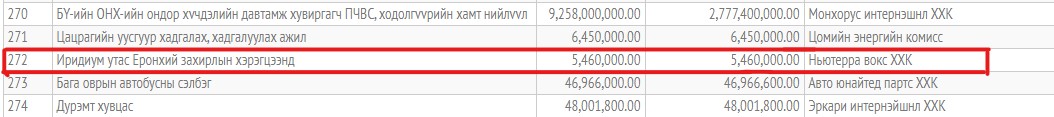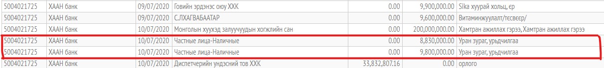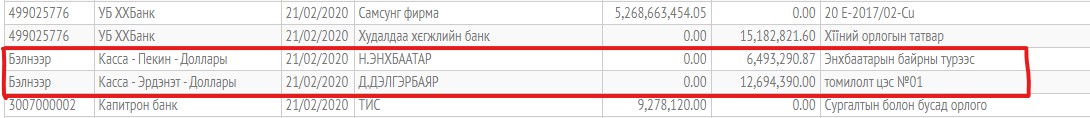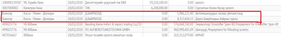 Харин орлогч захирал Г.Дэлгэрбаярын томилолтын зардалд 12 сая 600 гаруй мянган төгрөг бэлнээр төлжээ. Түүнчлэн Тэргүүлэх менежер Н.Энхбаатар мөн л томилолтын зардалдаа өнгөрсөн дөрөвдүгээр сард таван сая гаруй төгрөгийг үйлдвэрийн данснаас гаргуулсан байна.