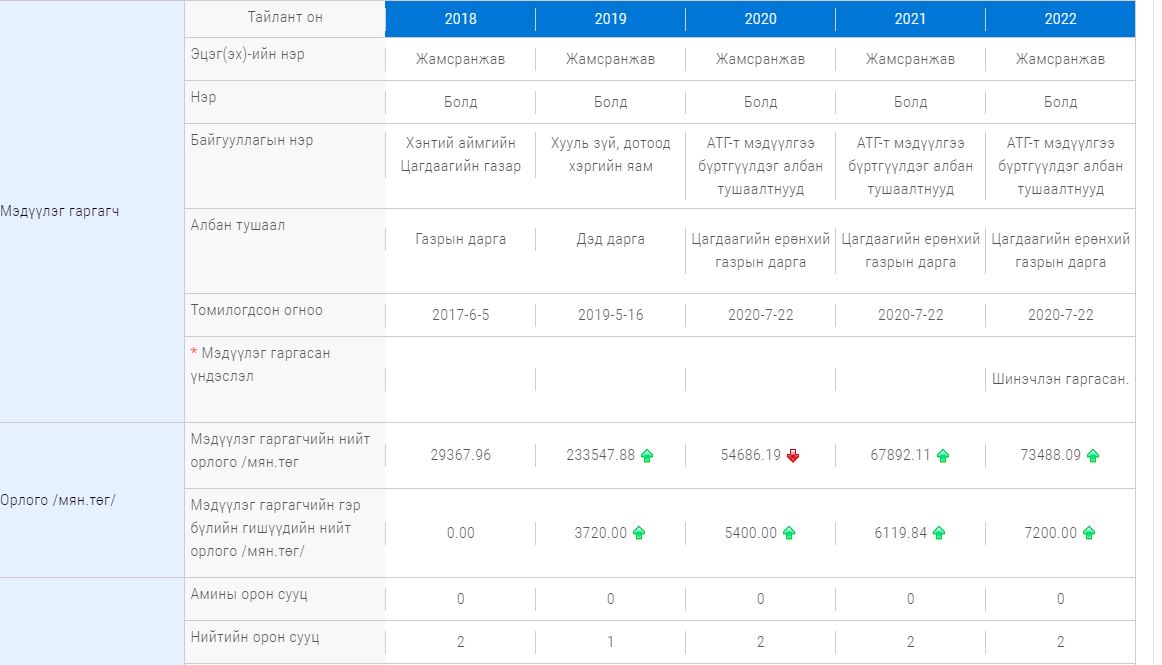 ЦЕГ-ын дарга асан Ж.Болд нь 2017 онд Хэнтий аймгийн цагдаагийн газрын даргаар ажиллаж, түүнээс хойш 2022 он хүртлэх АТГ-т мэдүүлсэн хөрөнгө орлогын мэдүүлгээс харахад түүний орлого тогтмол өсөж байжээ.