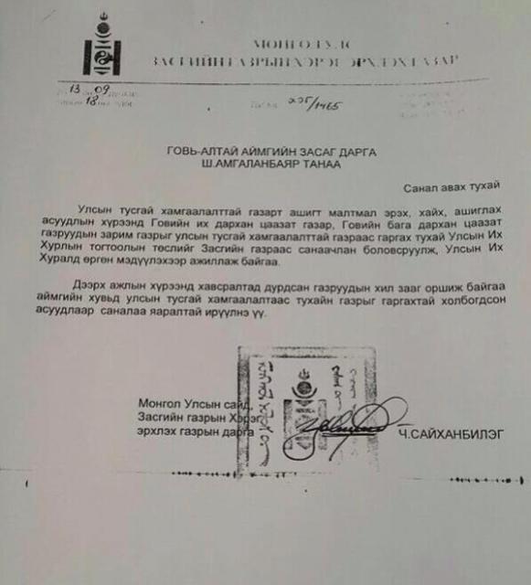 Түүнчлэн, Ерөнхий сайд асан Ч.Сайханбилэг ЗГХЭГ-ын дарга байхдаа буюу 2013 оны есдүгээр сард Говь-Алтай аймгийн тухайн үеийн Засаг дарга Ш.Амгаланбаярт “Говийн их болон бага дархан цаазат газрын зарим хэсэгт ашигт малтмал эрэх, хайх, ашиглах, тусгай хамгаалалтаас гаргах тогтоолын төслийг Засгийн газраас санаачлан боловсруулж, УИХ-д өргөн мэдүүлэхээр ажиллаж байгаа тул саналаа яаралтай ирүүлнэ үү” гэдэг албан бичиг илгээсэн байдаг. Тухайн үедээ орон нутгийн зарим удирдлагууд, Говийн их дархан цаазат газрын хамгаалалтын захиргааныхан, нутгийн иргэд эсэргүүцэж, асуудал тэгсгээд мартагдсан.