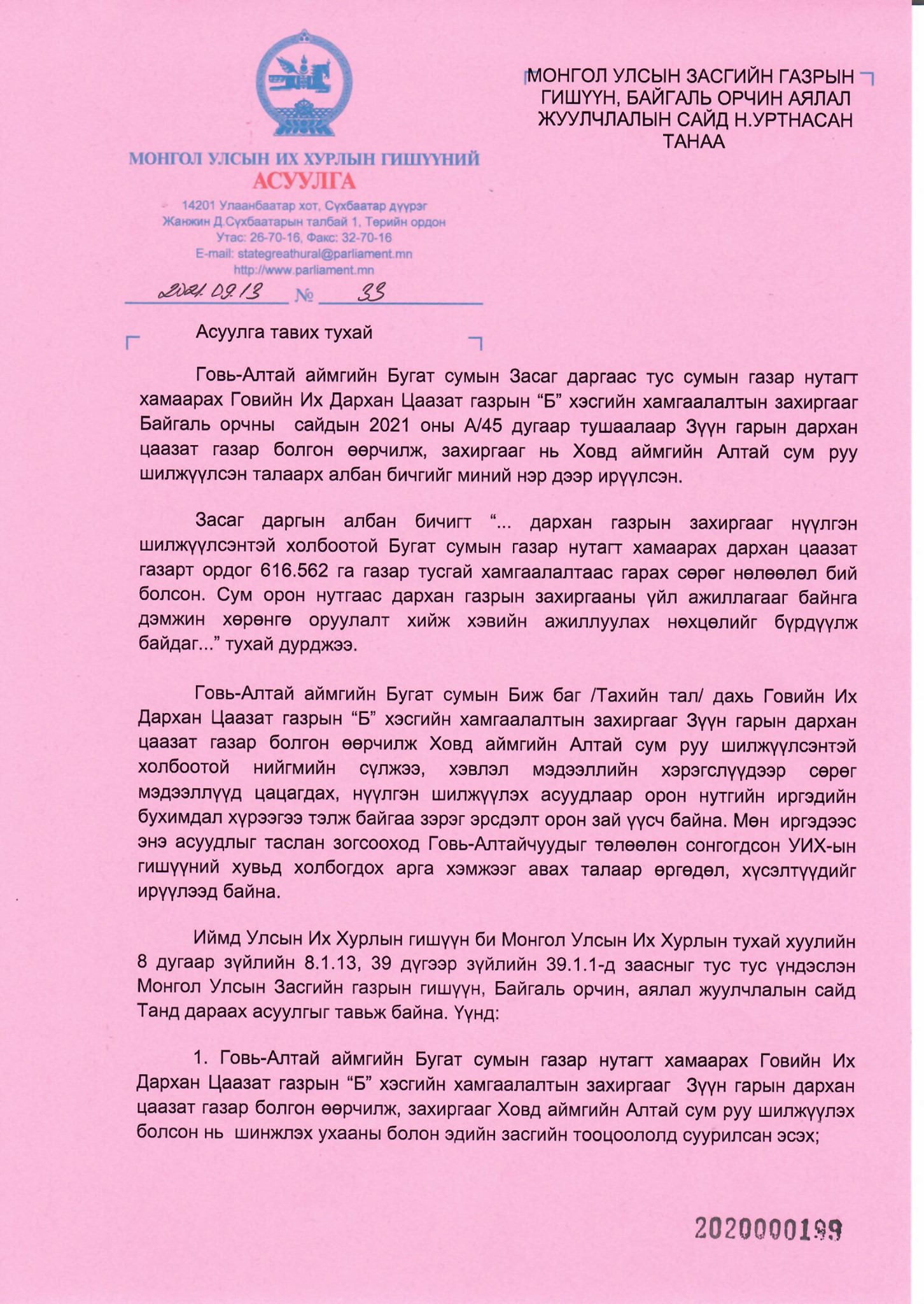 Гол асуудал нь, Говийн их дархан цаазат газрын “Б” хэсгийн хамгаалалтын захиргааг нүүлгэсэнтэй холбоотойгоор УИХ-ын гишүүн Б.Энх-Амгаланд Говь-Алтай аймгийн Бугат сумын Засаг даргаас албан бичиг ирсэн гэх бөгөөд уг албан бичигт “Дархан газрын захиргааг нүүлгэн шилжүүлсэнтэй холбоотой Бугат сумын газар нутагт хамааран дархан цаазат газарт ордог 616.562 га газар тусгай хамгаалалтаас гарах сөрөг нөлөөлөл бий боллоо” гэсэн байгаа юм.
