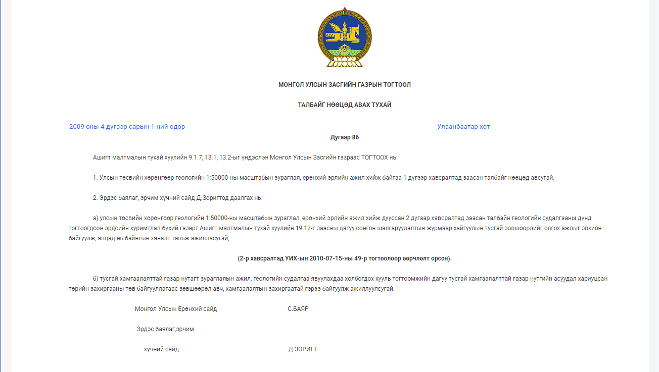 Хамтарсан Засгийн газрын үед буюу С.Баяр Ерөнхий сайд байхдаа “Талбайг нөөцөд авах тухай” 86 дугаар тогтоол гаргаж байсан. Тогтоол ёсоор 25 талбайг нөөцөд авахаар тусгасны дотор Говийн их дархан цаазат газрын А хэсэгт хамаарах талбай багтаж байсан нь нутгийн иргэдийн эсэргүүцэлтэй тулгарч, уг тогтоол цуцлагдсан байдаг. Тодруулбал, уг тогтоол Говь-Алтай аймгийн Алтай, Цогт, Эрдэнэ сумын нутагт хамаарах Наран сэвэстэйн талбай, Говь-Алтай аймгийн Эрдэнэ, Баянхонгор аймгийн Баян-Өндөр сумын нутагт хамаарах Хатан суудалын талбай багтаж байсан юм.