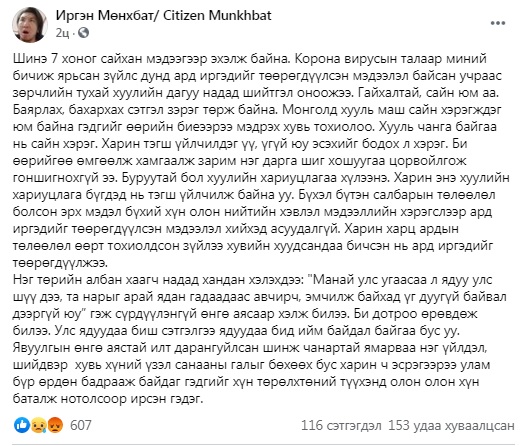 Монгол Улсын иргэн Д.Мөнхбат хоёр жилийн өмнө эх орондоо ирж байлаа. Харийн оронд ажиллаж, аав, ээж, ах дүүстээ яаран байж ирсэн тэр ард иргэдийн эрүүл мэндэд занилхийлсэн, халдварт өвчин тархах нөхцөл байдал үүсгэсэн, худал мэдээлэл тараасан “ялтан” болж хувираад хоёр оны нүүр үзлээ. Учир нь, тэр эх орондоо ирээд гурван удаа шинжилгээ өгч, эрүүл гэсэн бичигтэй 21 хоног “Энхсаран” сувилалд тусгаарлагдаж, 22 дох хоногтоо халдвартай нь батлагдсан юм. Эцэст нь, тэр энэ бүгдийг хүлээн зөвшөөрөхгүй байсан учир тусгаарлалтын хугацаа дууссан гэж үзээд, өрөөнөөсөө гарч, шууд дамжуулалт хийж, бодит нөхцөл байдлын талаар мэдээлэл өгсөн юм.