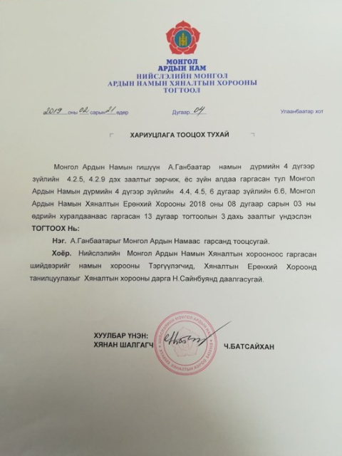 6.5.4. намын албан ёсны шийдвэр буюу олонхийн саналаар шийдвэрлэсэн асуудлаар энэ дүрмийн 1.5.4-т заасан зарчмыг зөрчсөн.