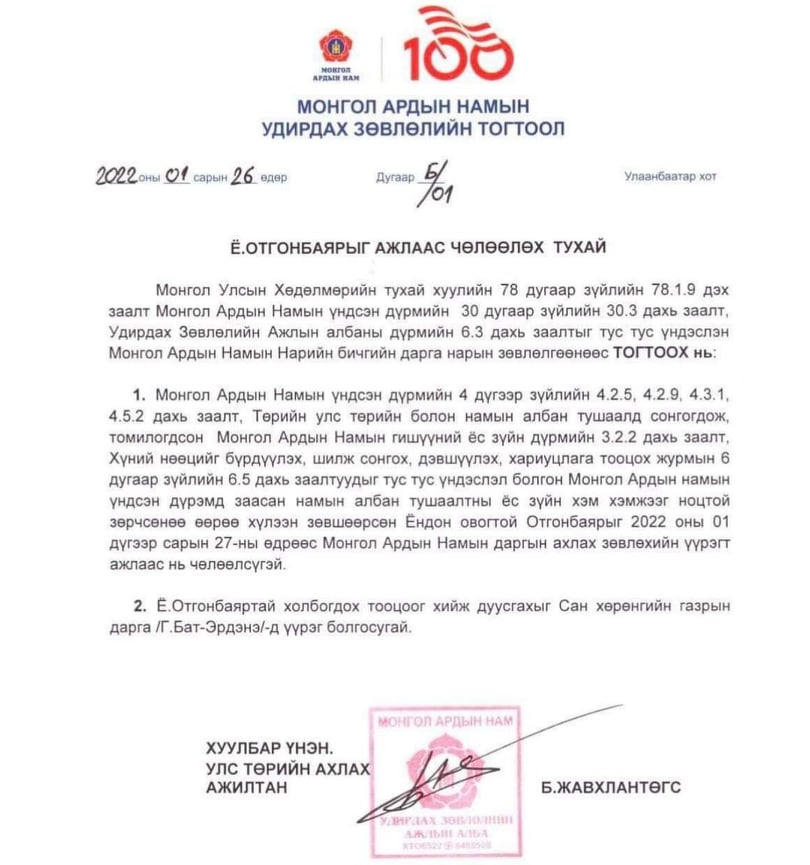 Түүнийг ажлаас нь чөлөөлсөн тогтоолд: