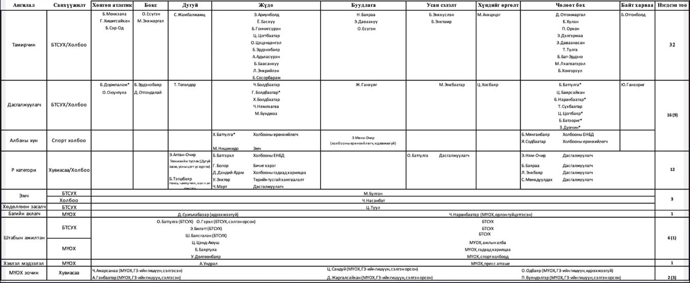 Цаашилбал, Б.Баттүшиг, Э.Бадар-Ууган хоёроос гадна МҮОХ-ны дэд ерөнхийлөгч Ч.Наранбаатар “багийн ахлагч” мандат, МҮОХ-ны гүйцэтгэх зөвлөлийн гишүүн зургаан хүн “зочин” ангиллын гурван мандат дундаа ашиглажээ. МҮОХ-ны ГЗ-ийн гишүүн, саяны сонгуулиар Сүхбаатар, Чингэлтэйн тойрогт Шинэ нэгдсэн эвслээс нэр дэвшээд унасан Ч.Амарсанаа, МҮОХ-ны ГЗ-ийн гишүүн, АН-аас жагсаалтаар УИХ-ын гишүүн болсон А.Ганбаатар, МҮОХ-ны гишүүн, НИТХ-ын дарга асан, дуулиант 60 тэрбумын хэргээр илүүтэй танигдсан Ц.Сандуй, МҮОХ-ны гишүүн, БТСУХ-ны даргаар ажиллаж байсан Д.Жаргалсайхан, МҮОХ-ны гишүүн, Сү.Батболдыг Ерөнхий сайд байхад зөвлөхөөр нь ажиллаж, мөн түүний “Алтай холдинг” ХХК-ийн дэд захирал, “Чингис" зочид буудлын гүйцэтгэх захирлаар ажиллаж байсан О.Одбаяр нарын зургаан хүний нэр бичигджээ. Түүнчлэн спортын холбоодоос Жүдо бөхийн холбооны ерөнхийлөгч, УИХ-ын гишүүн Х.Баттулга холбооныхоо Ерөнхий нарийн бичгийн дарга Б.Батгэрэлтэй, Чөлөөт бөхийн холбооны ерөнхийлөгч, МАН-ын Ерөнхий нарийн бичгийн дарга Я.Содбаатар, холбооны Ерөнхий нарийн бичгийн дарга Б.Мянганбаяртай тус тус “албаны хүн” ангиллаар оролцжээ. Харин Монголын буудлагын холбооны ерөнхийлөгч, УИХ-ын гишүүн асан Э.Мөнх-Очирыг мандатаа идэвхжүүлээгүй гэж бүртгэсэн байгаа юм.