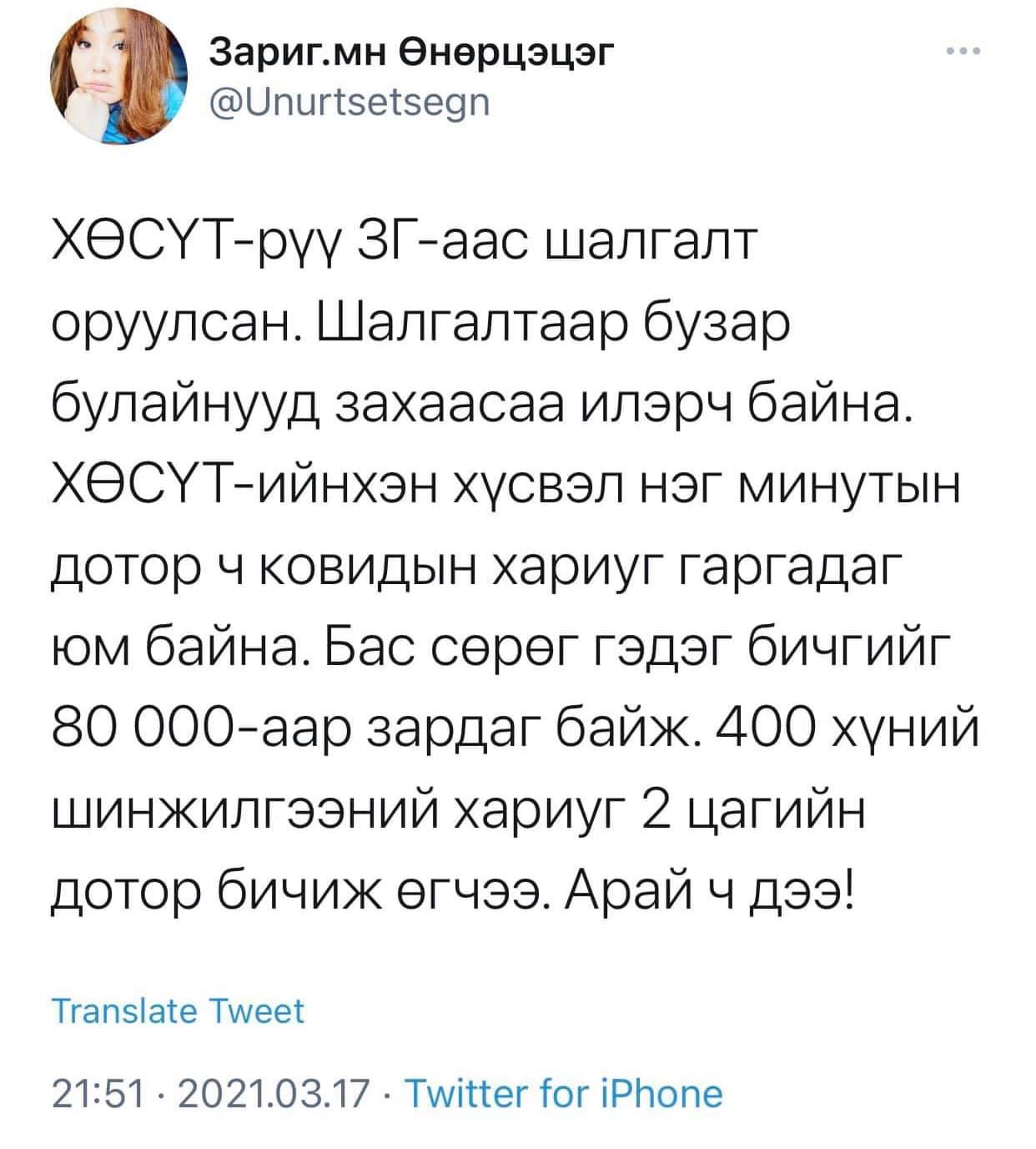 Үүнээс гадна тэр өмнөх Засгийн газрынхны үсээ цайж, зүсээ гундтал ажиллаж, ковидыг тархаахгүйн төлөөх хөл хориог ажлаа авуутаа зад тавьж, “Одоо дахиж хөл хорио тавихгүй. Дэлхий ертөнц ковидтой зэрэгцэн амьдраад байхад бид юунаас нь айх гэж” хэмээн “томорч”, хөл хориог сулруулсан билээ. Үүний гороор өнөөдөр 4000 шахам хүн ковидын халдвартай нь батлагдахаас гадна “Нийтийн дунд халдвараа алдчихлаа. Одоо ковид тархаагүй газар, гудамж гэж байхгүй. Тусах эсэх нь иргэн таны ухамсараас шалтгаална” гэсэн тайлбар тавиад сууж байгаа нь дэндүү хариуцлагатайнх гэж ойлгох уу.