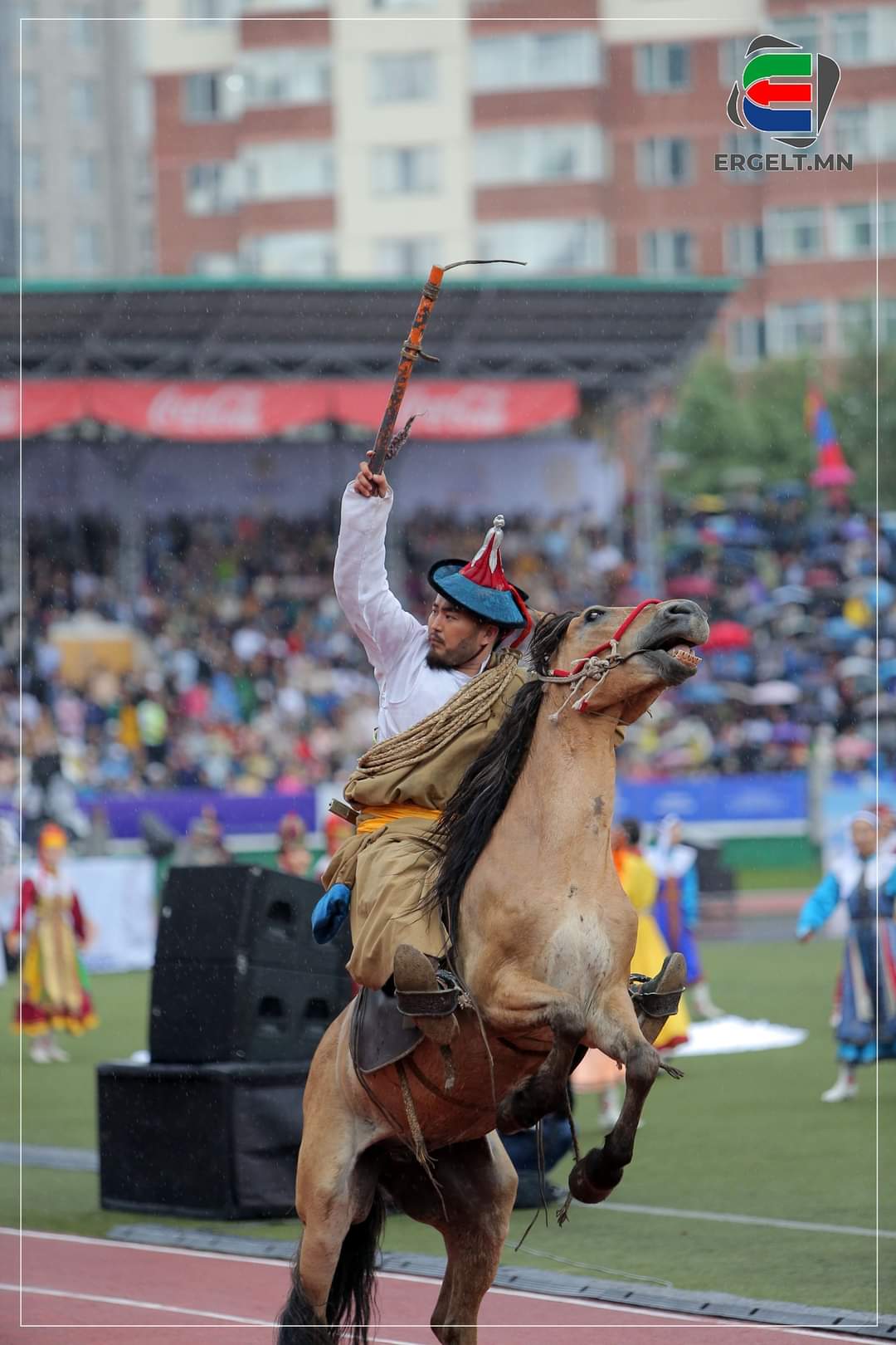 Жил бүрийн наадмын нээлтийн үеэр морьт харвааны үзүүлбэр, морьдоо,хөтөлсөн үндэсний дээл хувцсаараа гоёсон иргэд, морьт цэргийн цуваа гээд олон үзүүлбэрт морь оролцуулдаг билээ. Тэгвэл энэ жилийн нэгэн шинэлэг бөгөөд онцлох үйл явдал нь 120 морь оролцсон наадмын нээлт гэдэг байв. Төв цэнгэлдэх хүрээлэнгийн ногоон талбайн хоёр талаас давхилдан талбайн голд уулзалдаж нэгнийгээ ноолоох гүү, унага хоёр энэ нээлтийн уярам хэсгийн нэг байлаа.