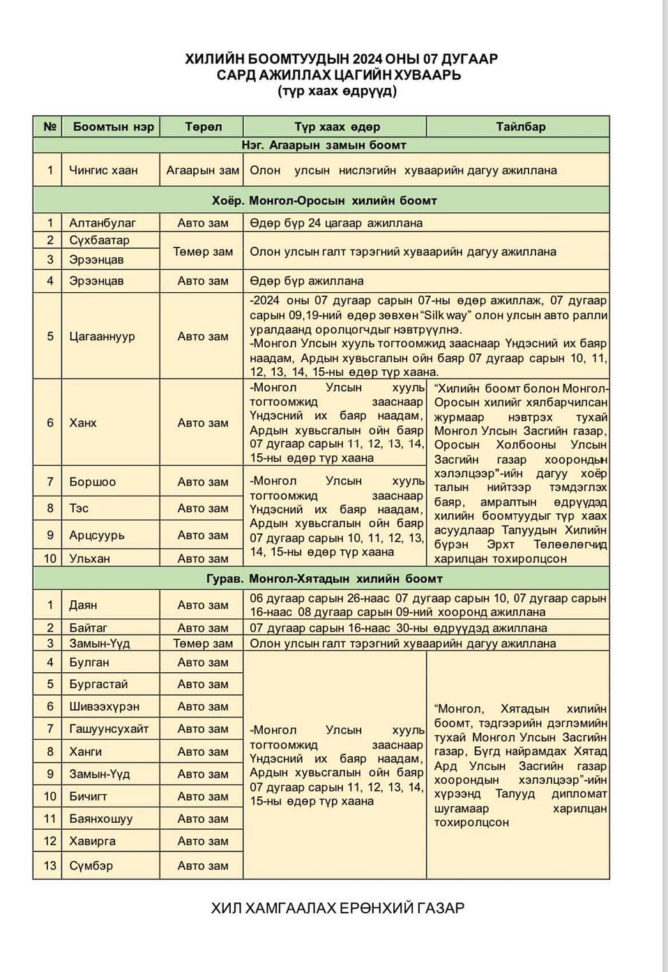 | Монгол Улсын хилийн боомтуудын долдугаар сард ажиллах цагийн хуваарь |